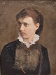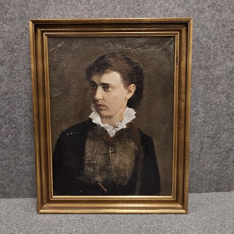 Oliemaleri på lærred med et portræt af en sortklædt kvinde med opsat hår, hvid krave og en halskæde med et korsKunstner for os ukendt