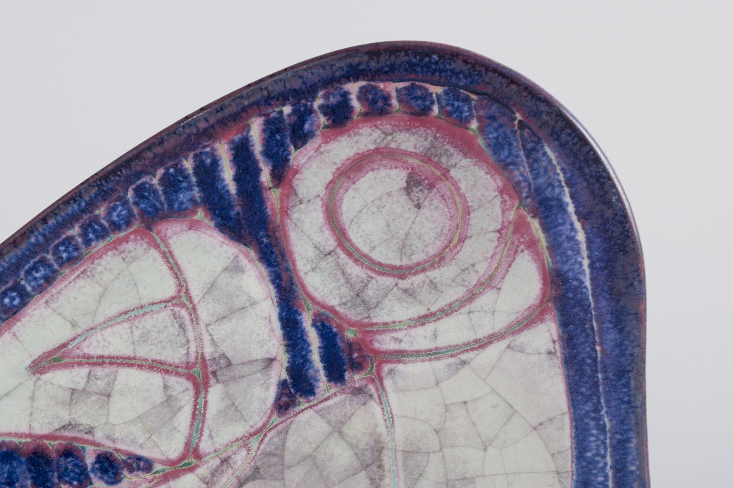 Glasur i blå, rødlige samt lyse toner.