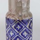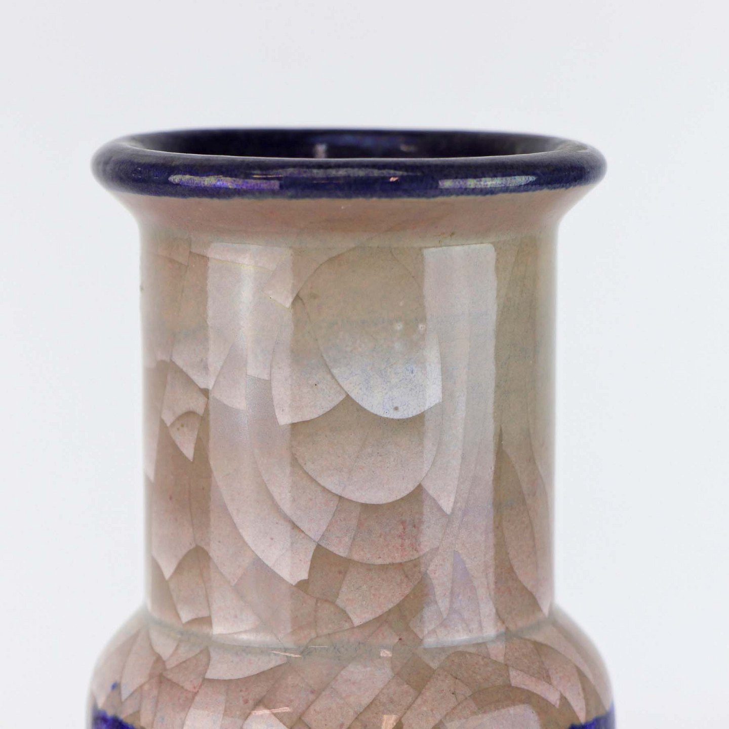 Vase i glaseret keramik med blåt geometrisk mønster på lyst facetteret baggrund. Nr. 5876-2Producent Michael Andersen, Bornholmsk keramik