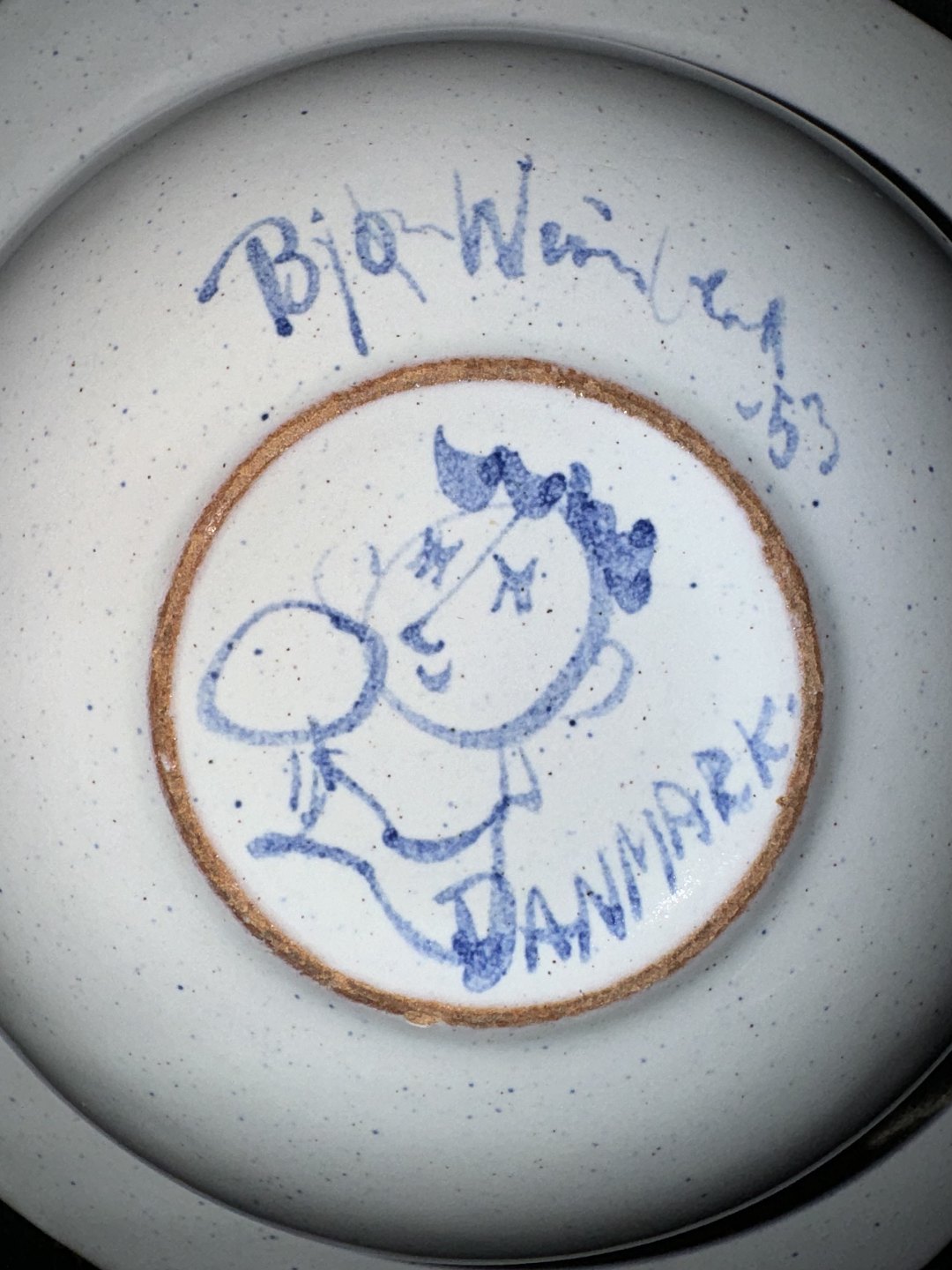 SJÆLDEN SKÅL: Otte-kantet skål af Bjørn Wiinblad med dekoration af et par huse med træer i 1953. Dekoreret af Bjørn Wiinblad. Signeret på bunden. Fremstår i perfekt stand. Mål:H. 5,7 cm Toppens ydre diameter 19 cm.v/ Jesper Reutemann