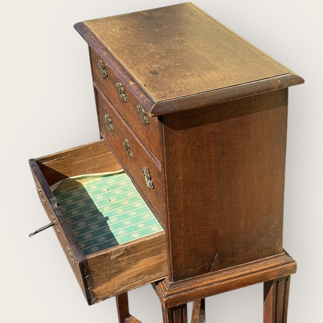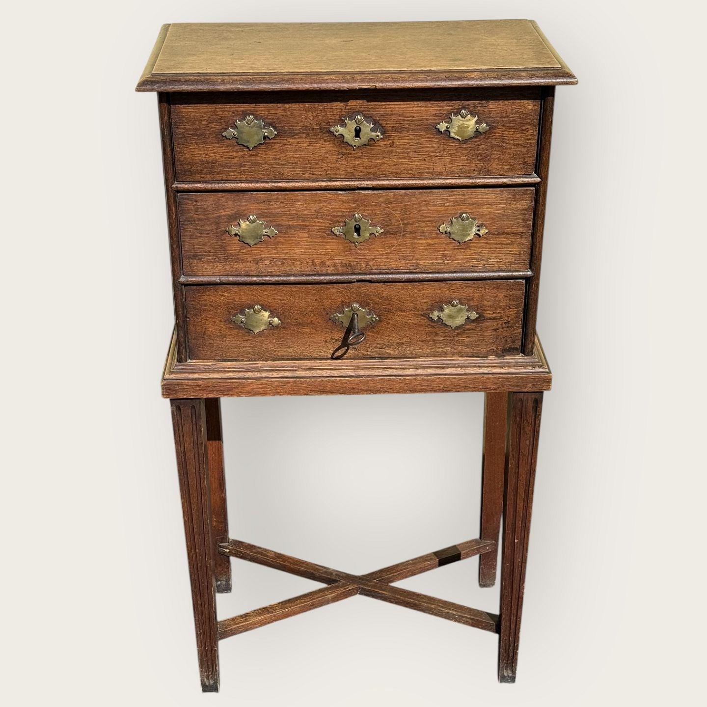 Older oak furniture with 3 drawers on high legs, Slight age-related signs of wear, otherwise in good condition, Dimensions HxWxD 99x53x30cmStock: 1