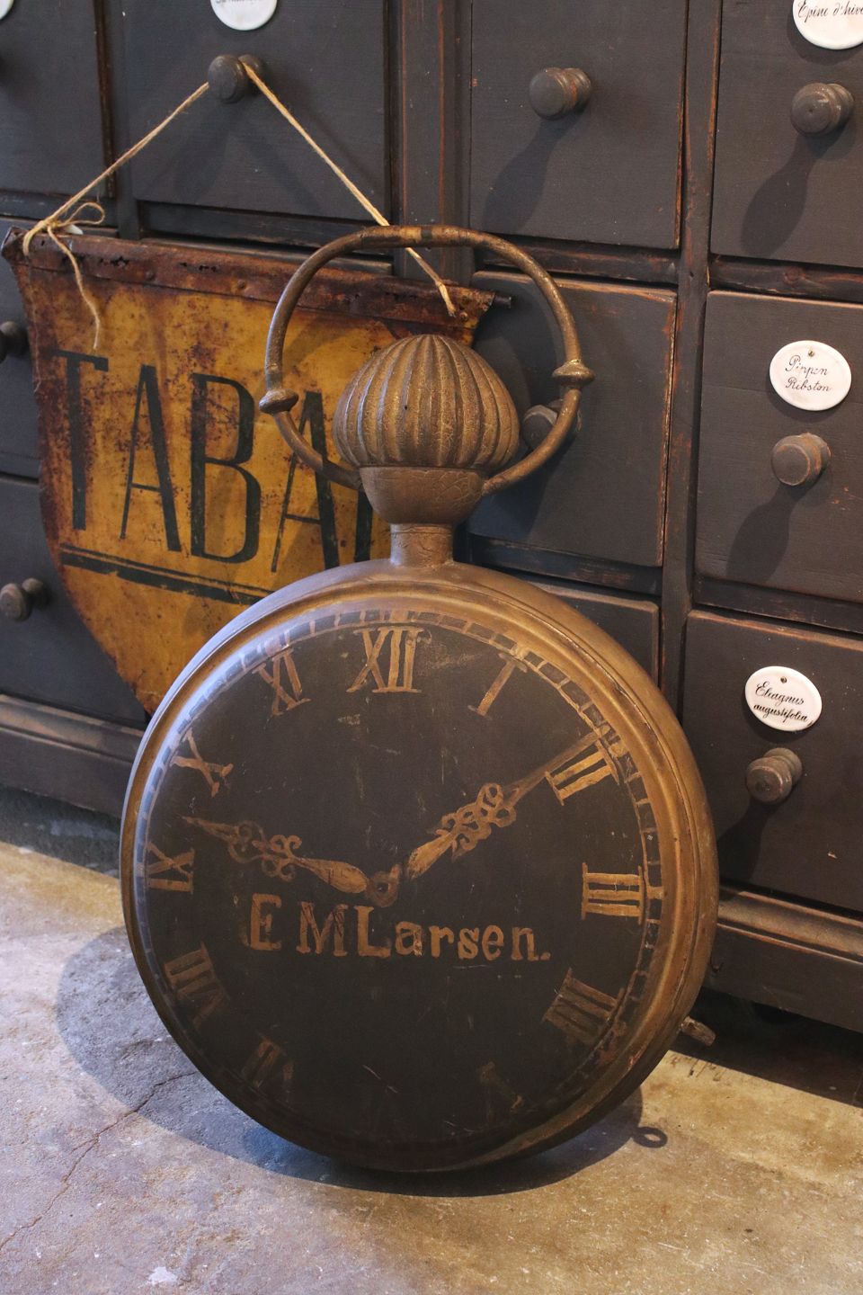 Decorative 19th century hanging sign from a watchmaker's shop in the shape of an old pocket watch made of copper and metal with old paint and a really nice patina. H: 71cm. W: 48cm. D: 17cm. Dial dia.: 48cm.