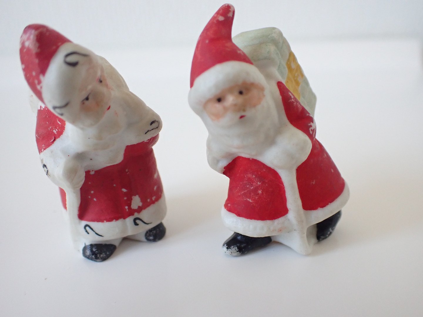 4 håndmalede tyske biscuit julemænd 2 med gavesække på ryggen og 2 uden.. Ca. 1930. Højde: 2 stk. på 3,8 til 250 kr. pr. stk. og 2 stk. 5 cm. til 300 kr. pr. stk. I pæn tidstypisk stand. Dealer