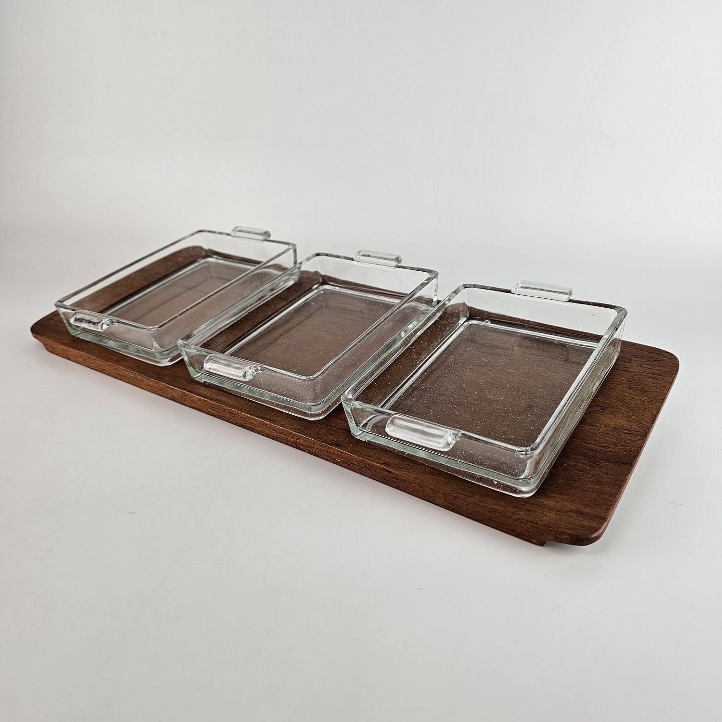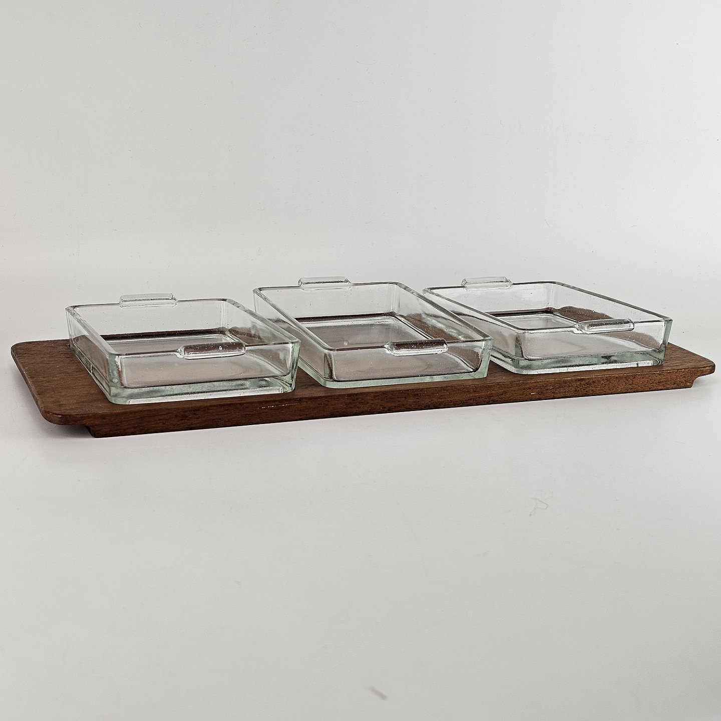 Cabaret fad i teaktræ, med tre skåle af glas.Fad