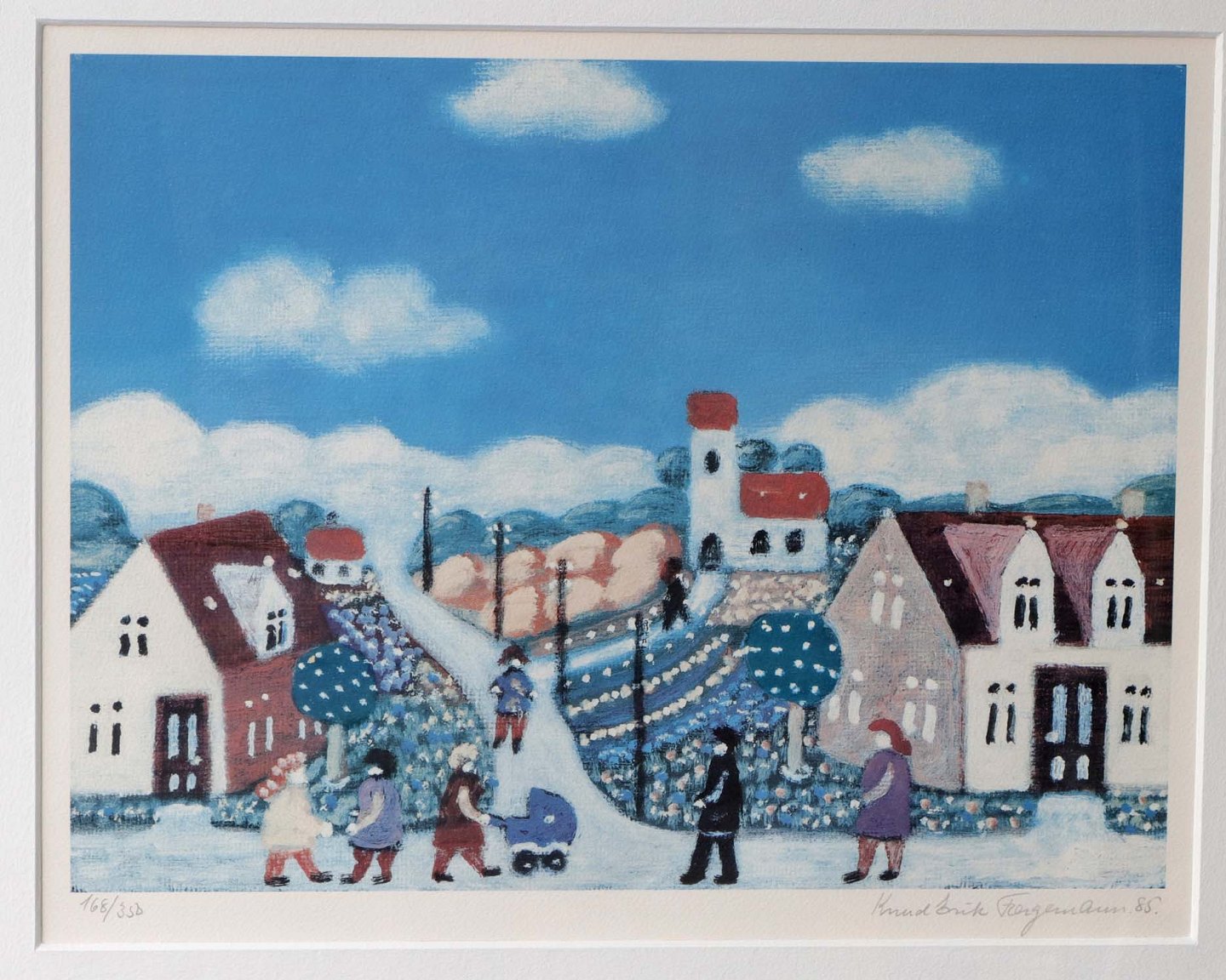 Indrammet litografi med passpartout i sølvmalet træramme. Motiv af landsbyliv i naivistisk stil. Dateret 1985. Nr 168 ud af 350 eksemplare.