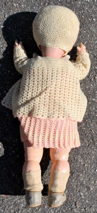 Large Heubach - Köppelsdorf doll 342.5. circa 1920, Germany. Stamped. Porcelain head, composite body. Crocheted clothing and leather shoes. Blue eyes that can open and close, with lashes of hair. L: 54 cm.Great condition!