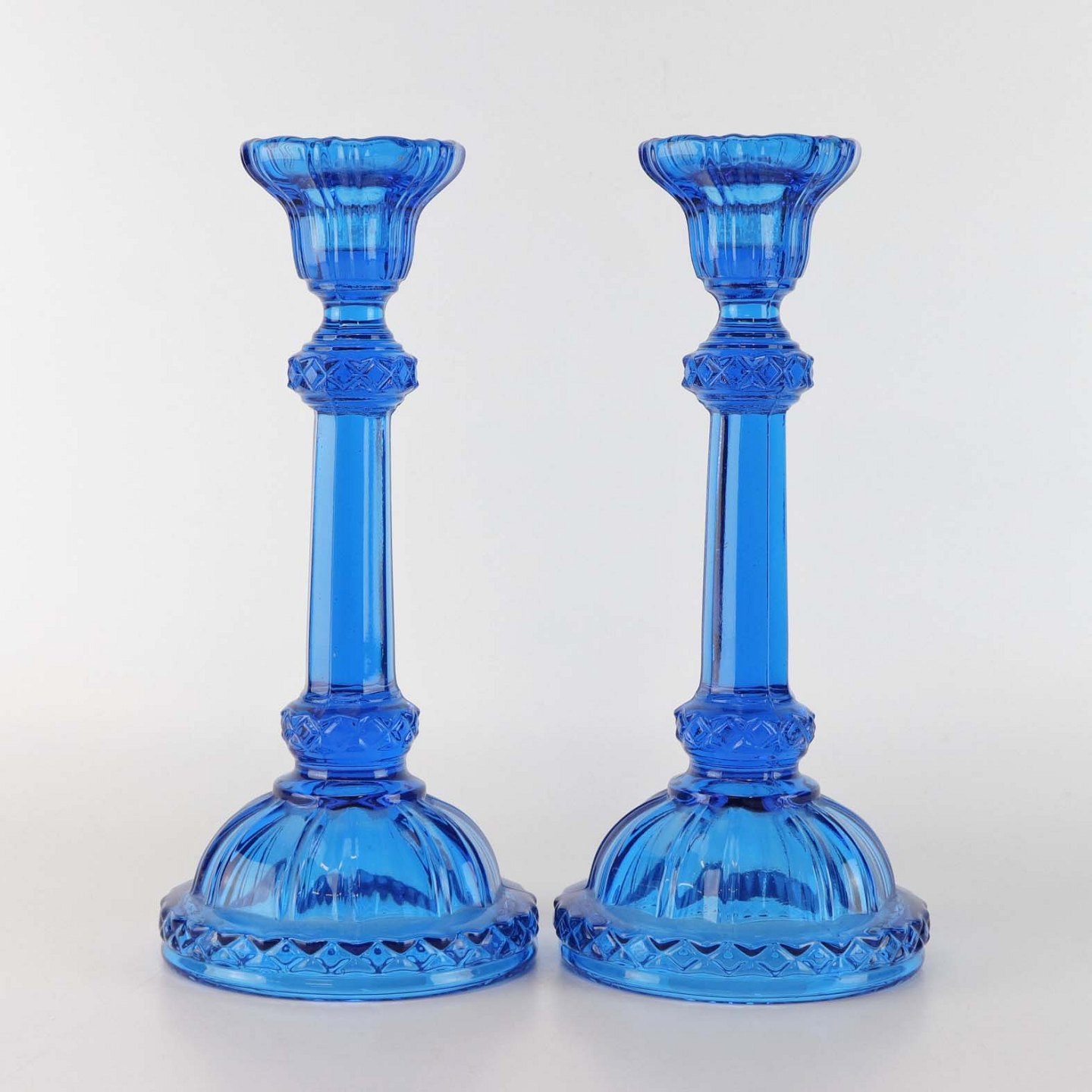 Et sæt lysestager i presset blåt glas.Producent ukendt