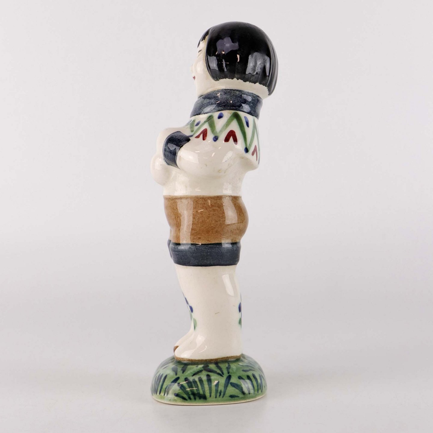 Børnehjælpsfigur i fajance med motiv af smilende Eskimo pige i nationaldragt fra år 1959. Figuren er en del af en serie, som blev lavet i forbindelse med børnehjælpsdagen.Formgiver Herluf Jensenius (JUS)