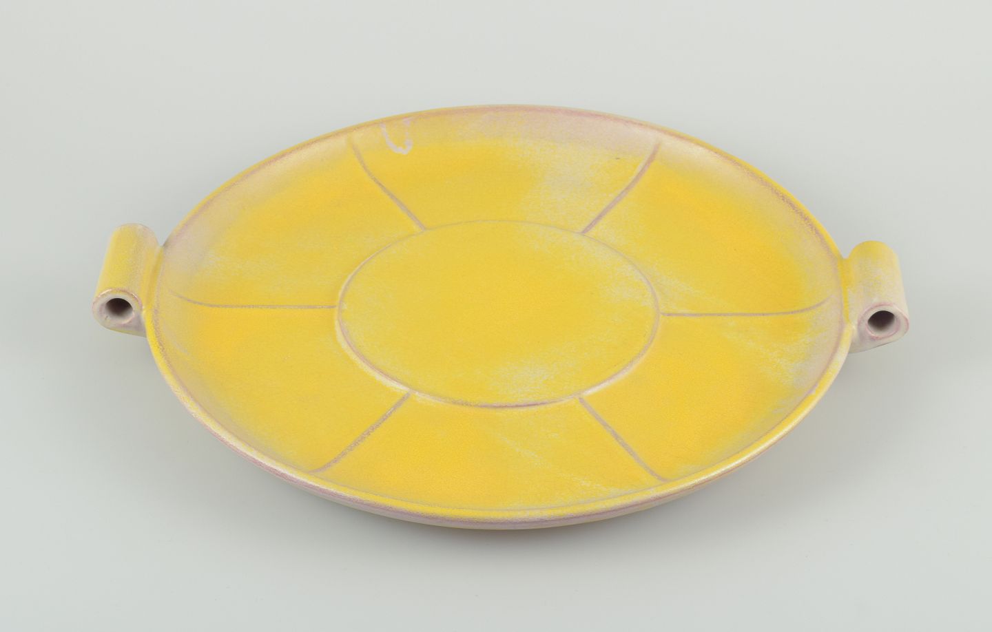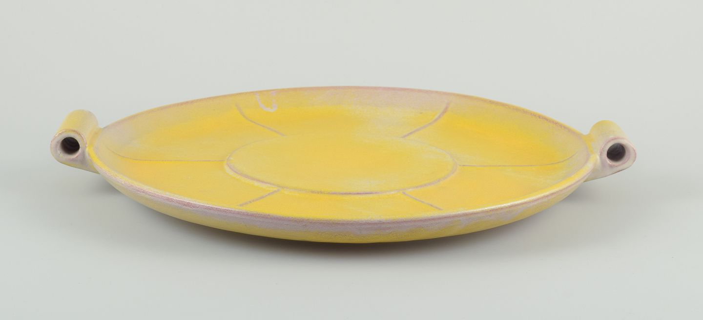 Finnish ceramic dish in Art Deco style. With two handles.Yellow glaze. Hand painted.