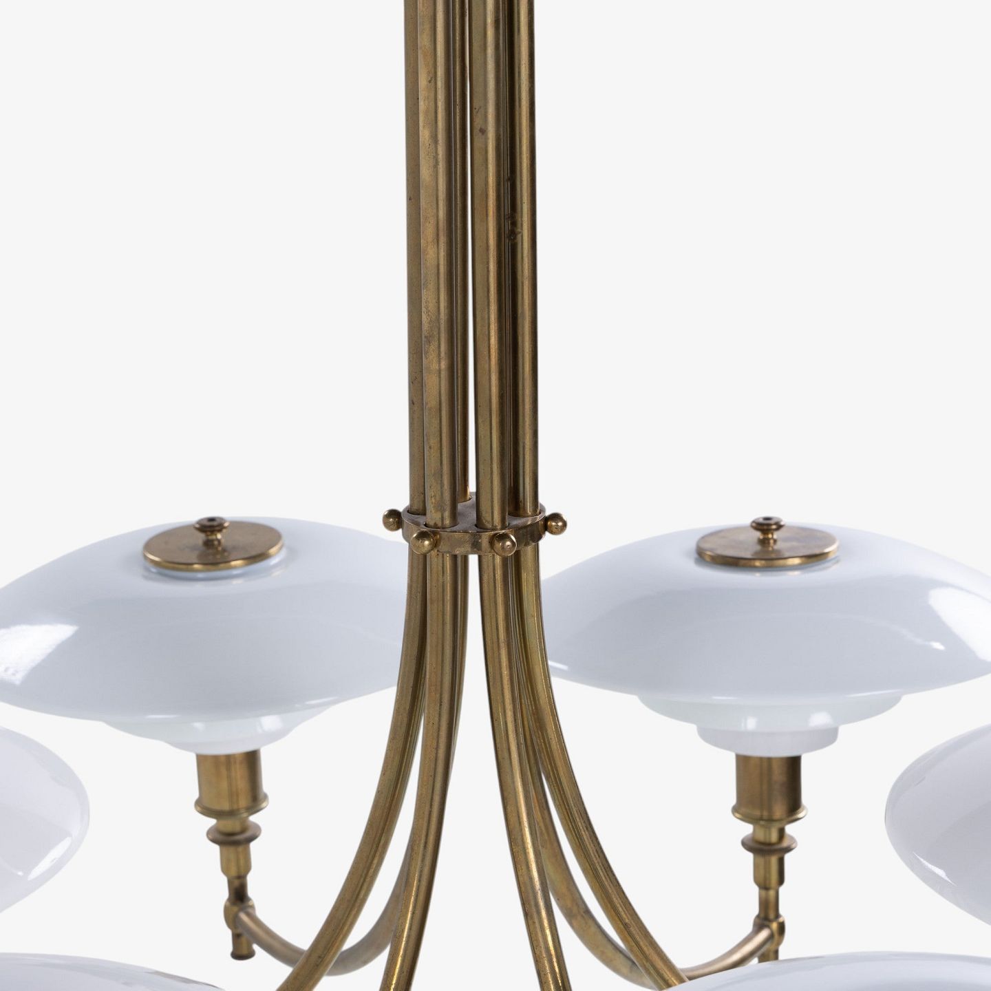 PH 3/2 - Seks-armet 'Ankerkrone' i messing med skærme i ét-lags hvidt opalglas. Formgivet mellem 1929-1936. Stemplet 'PAT. APPL.'