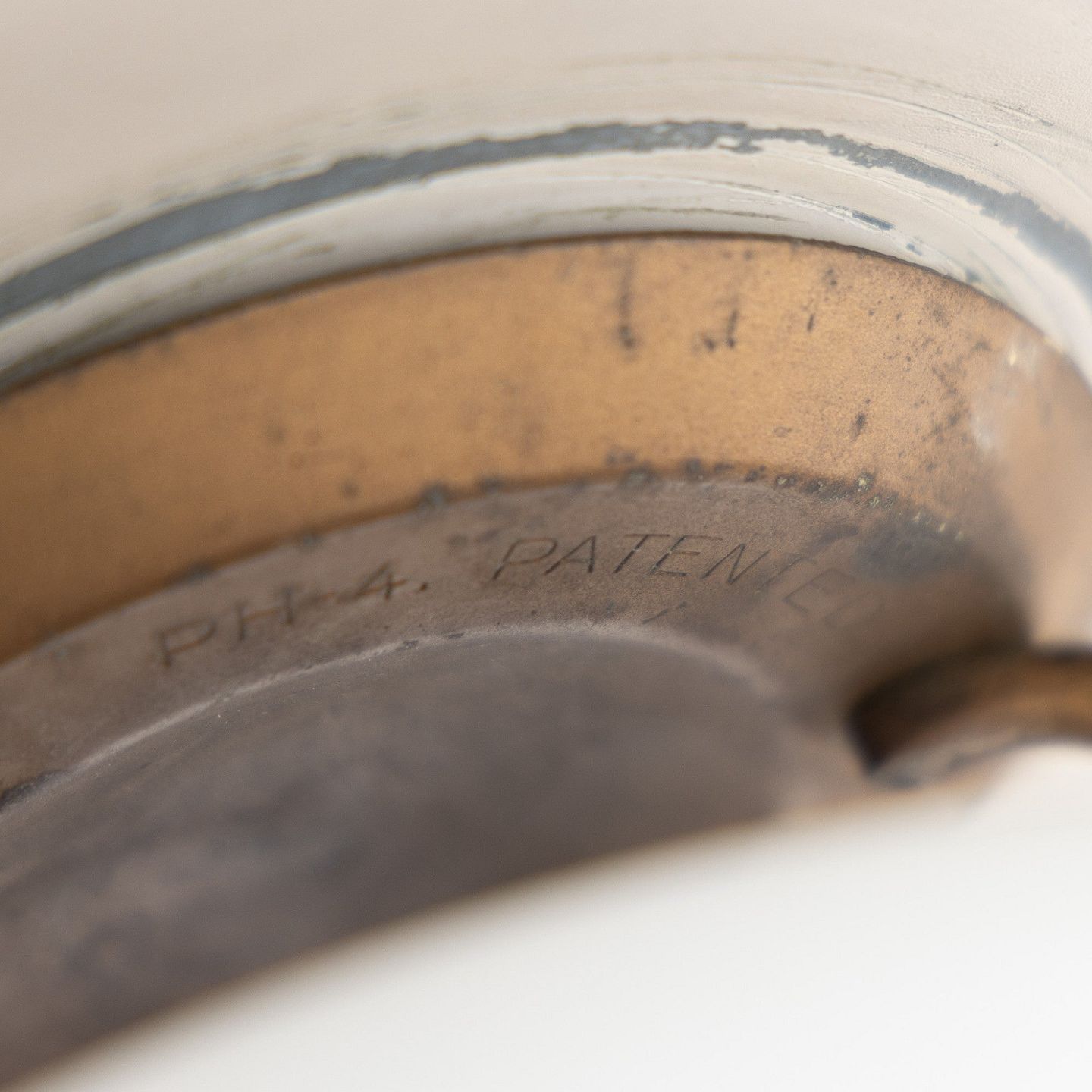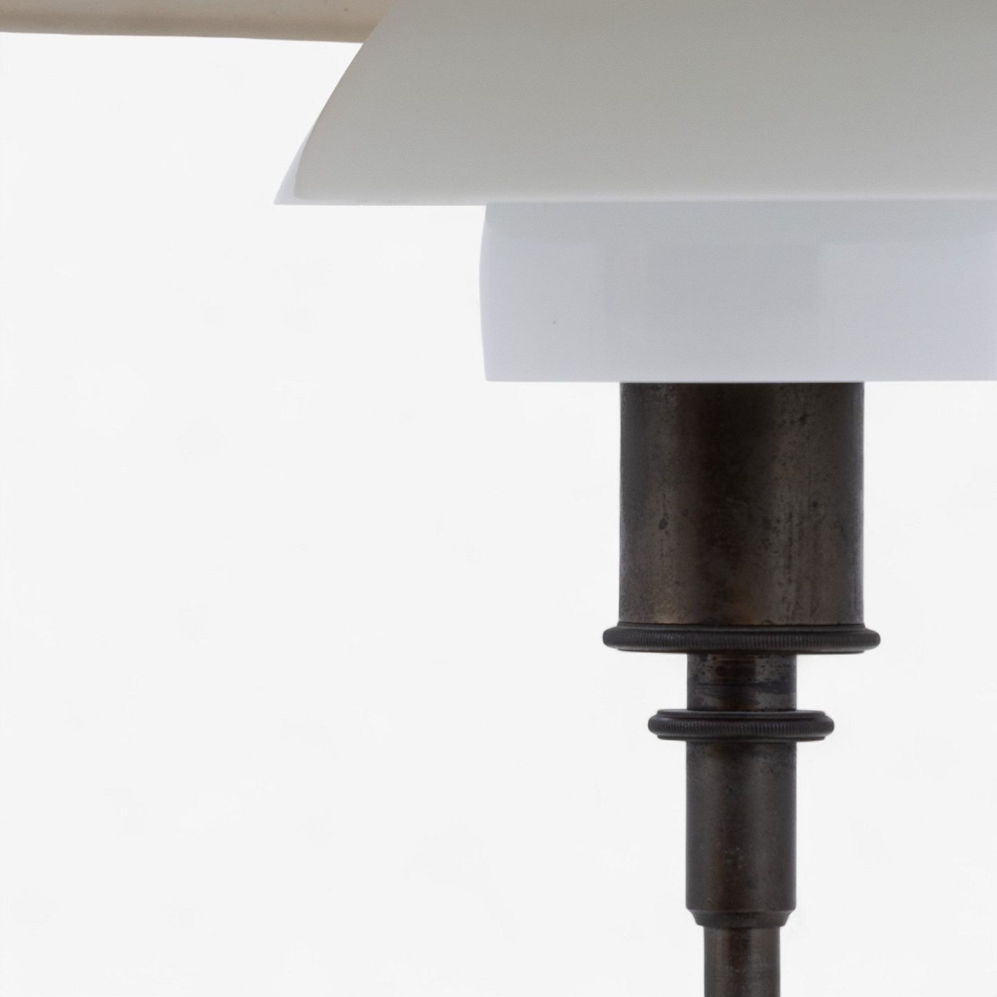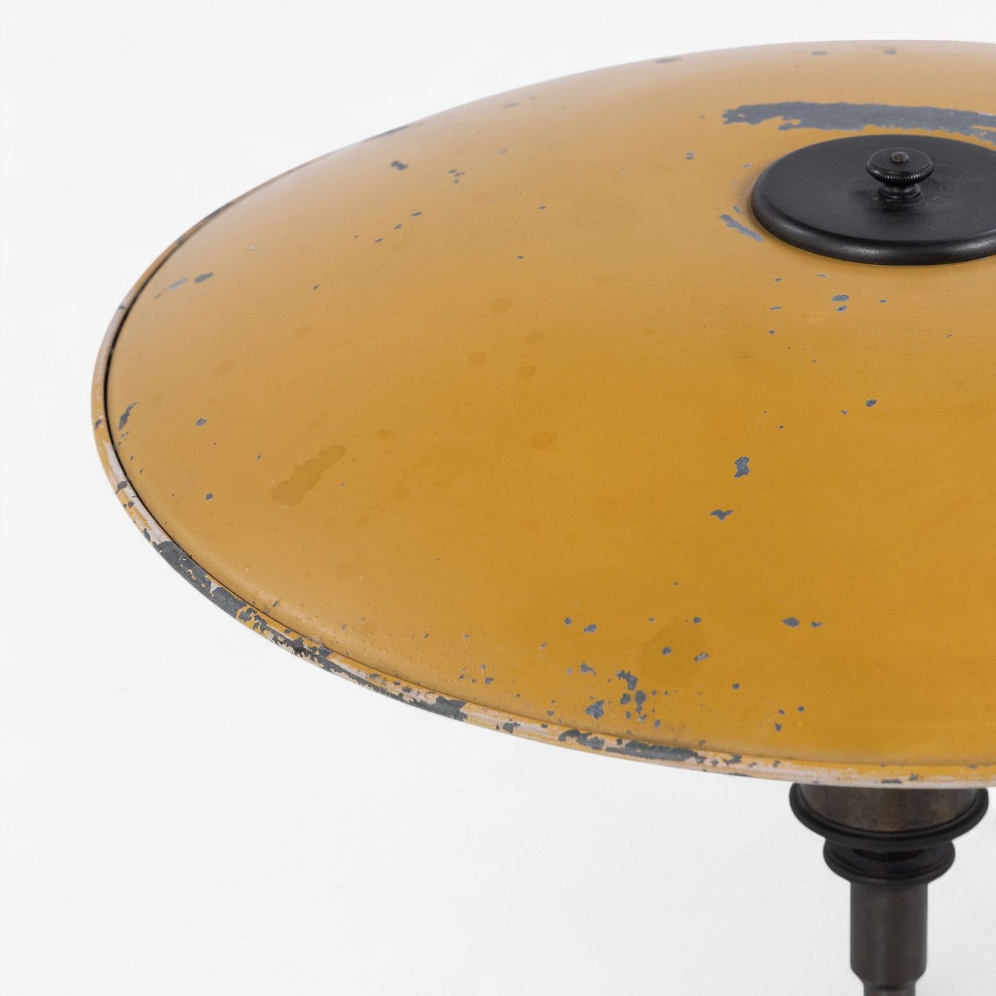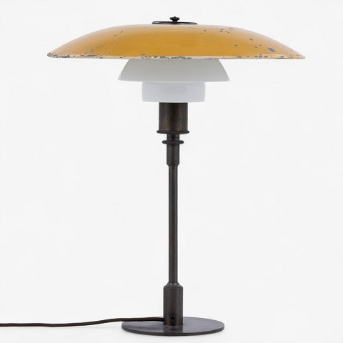 PH 4.5/3 - Table lamp in burnished brass with upper shade in yellow-lacquered zinc shade and middle and lower shade in white opal glass. Stamped 'PATENTED'. From c. 1930.
