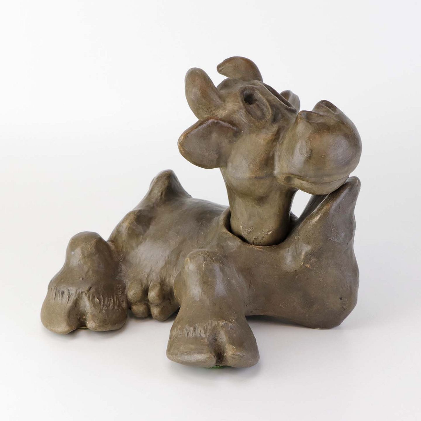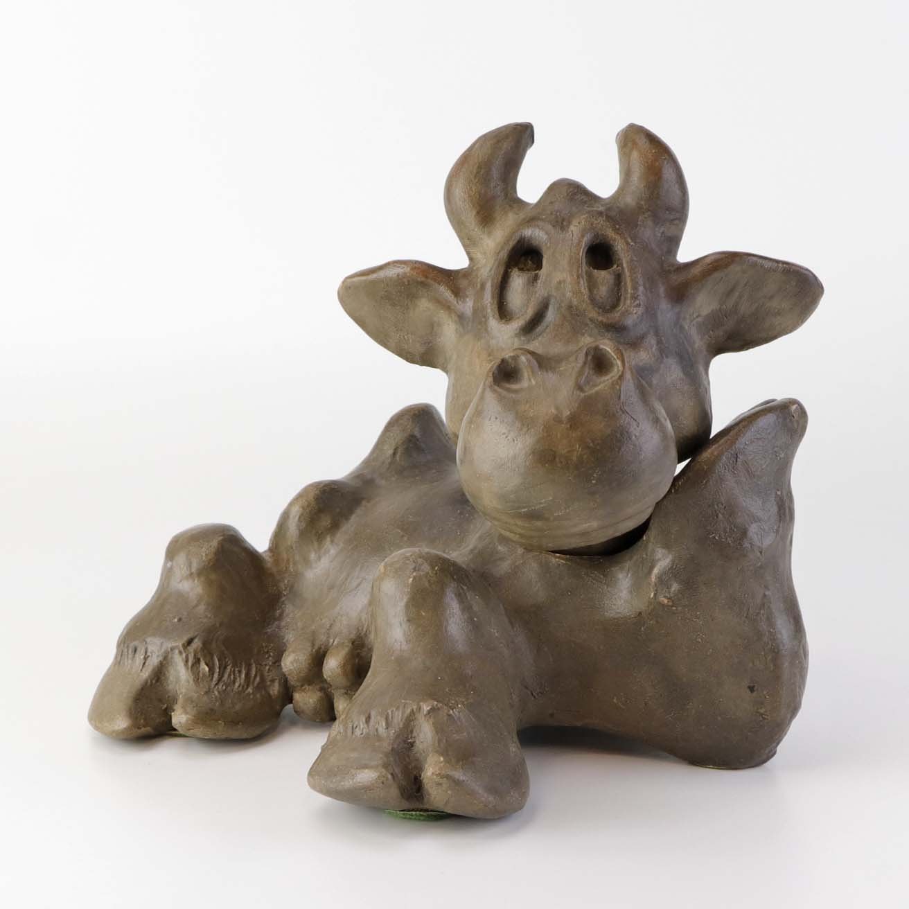 Figur i keramik med motiv en liggende ko med bevægeligt hoved som hviler den ene hov. Hovedet kan roteres.Formgiver Thomas Dam
