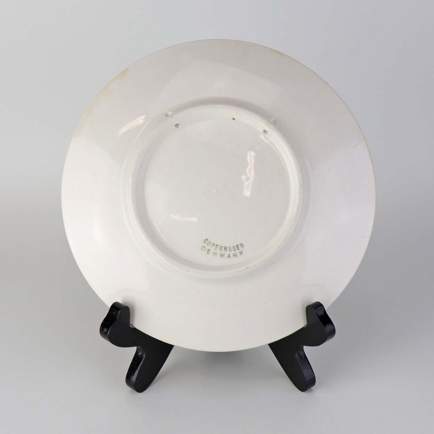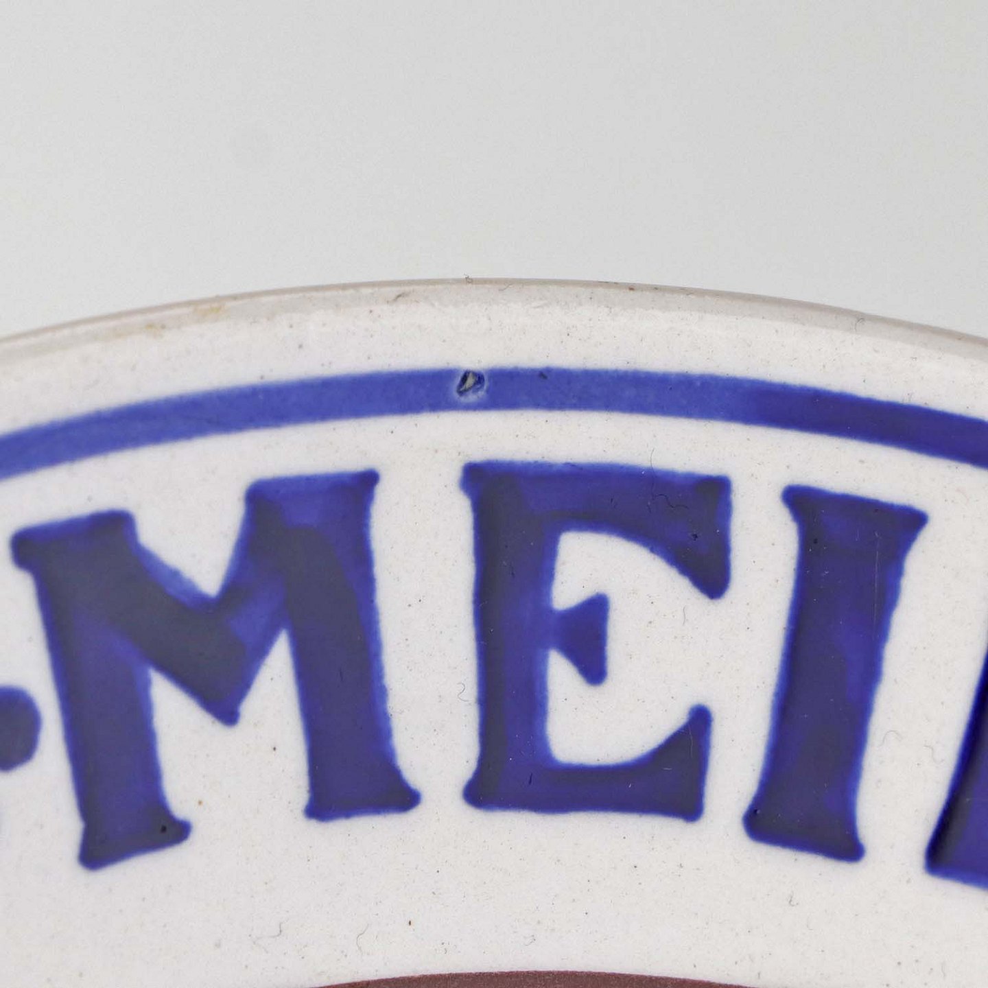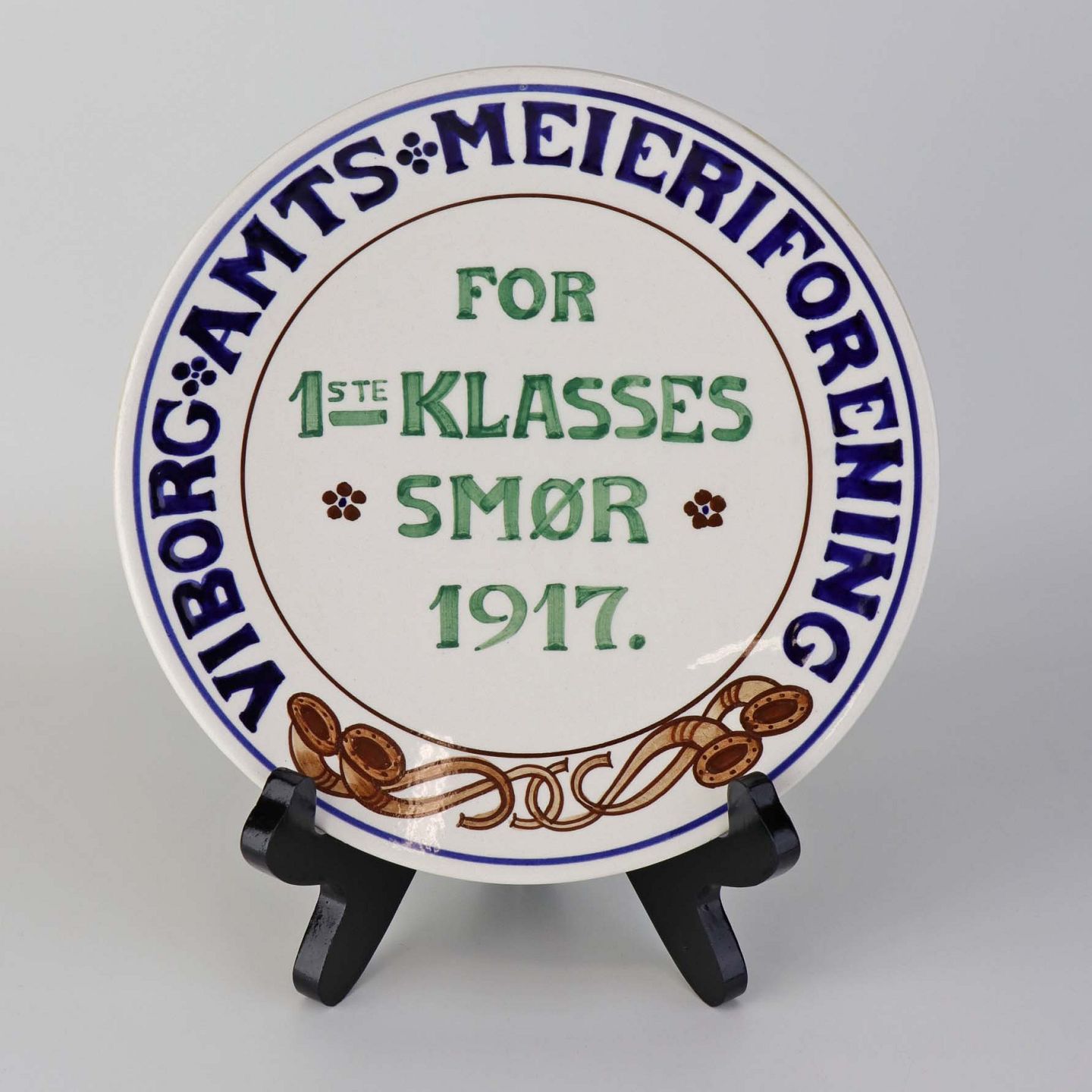 Ældre platte i fajance med teksten Viborg Amt Mejeriforening for 1ste klasses smør 1917 og motiv af fire blæseinstrumenter kaldet lur.Producent Aluminia