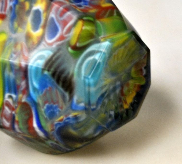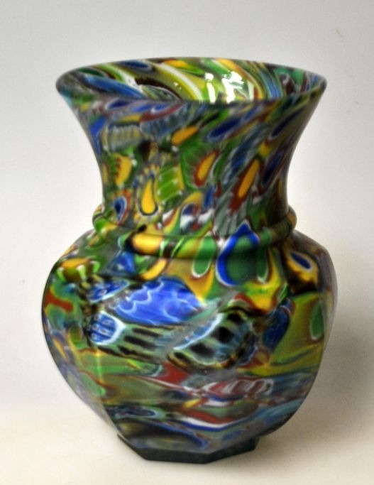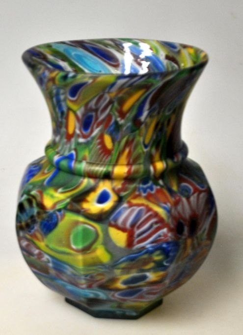 Millefiori vase Johansfors glassworks, Sweden. Interior multi-colored glass; exterior frosted glass. circa 1920. H.: 12.5 cm.Perfect condition!