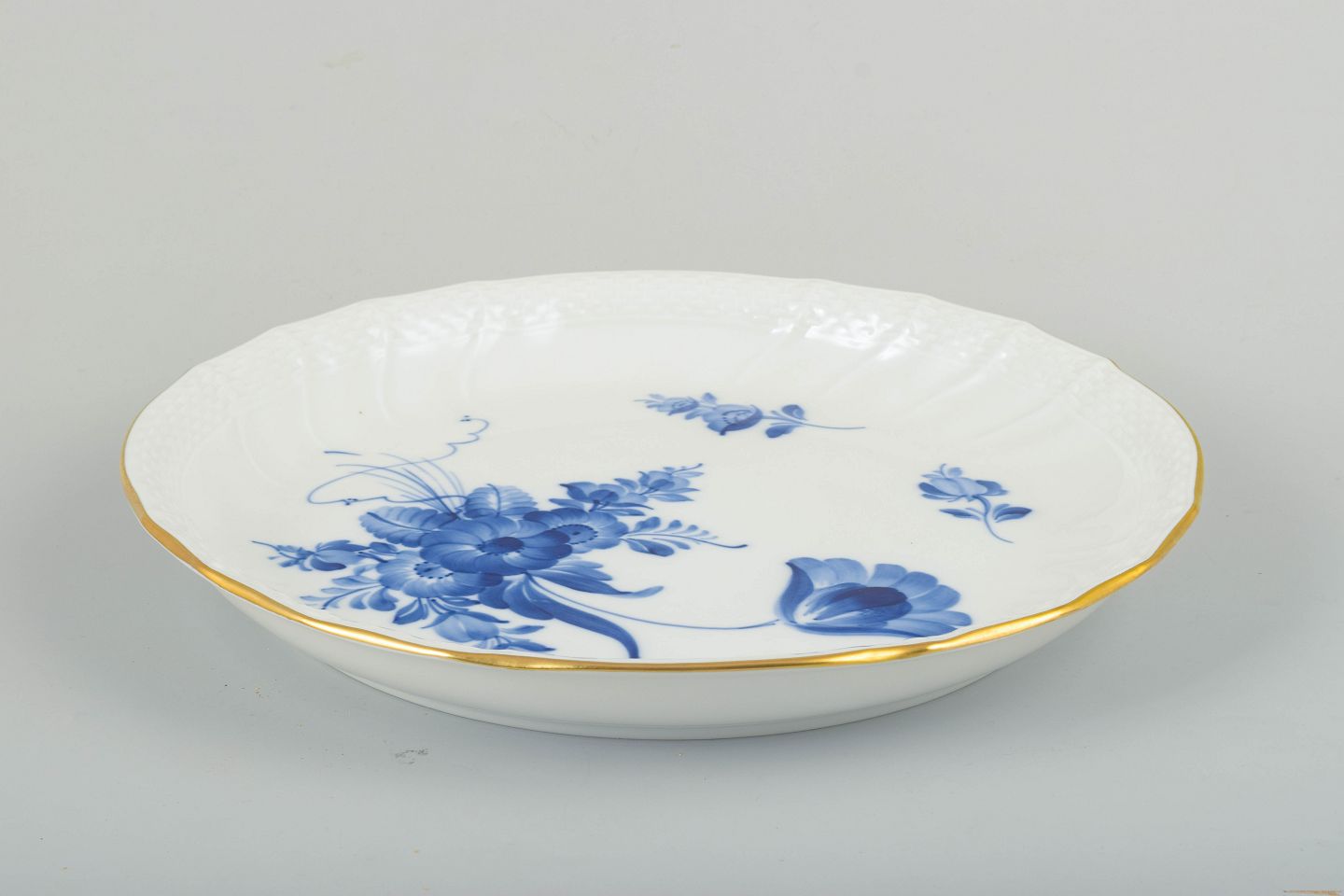 Founded in 1775, Royal Copenhagen is one of the world’s most renowned porcelain manufactories. The “Blue Flower” pattern was introduced in the late 18th century as a free floral motif inspired by European Rococo. Produced in several versions—Curved, Basketweave, and Angular—the rare editions with applied gilding were often made as special orders and are today highly sought after among collectors.