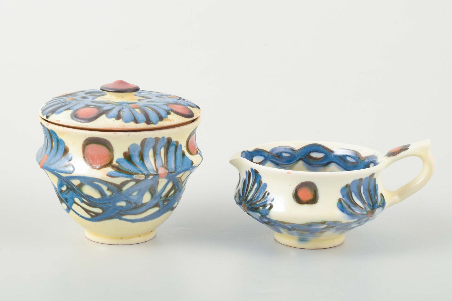 Kähler, DanmarkFlødekande og sukkerskål i Marguerite-stellet, glaseret keramik hånddekoreret med polykrome blomster- og rankemotiver i blå og rødlig glasur på lys bund.