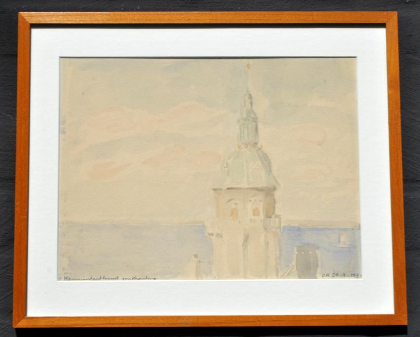 Kielberg, Ole (1911 - 1985) Denmark: The Commander's Tower at Kronborg, 1951. Watercolor on paper. Signed: OK 26-9-1951. H: 23.5 cm. W: 31.5 cm.Framed: H: 33 cm. W: 40 cm.