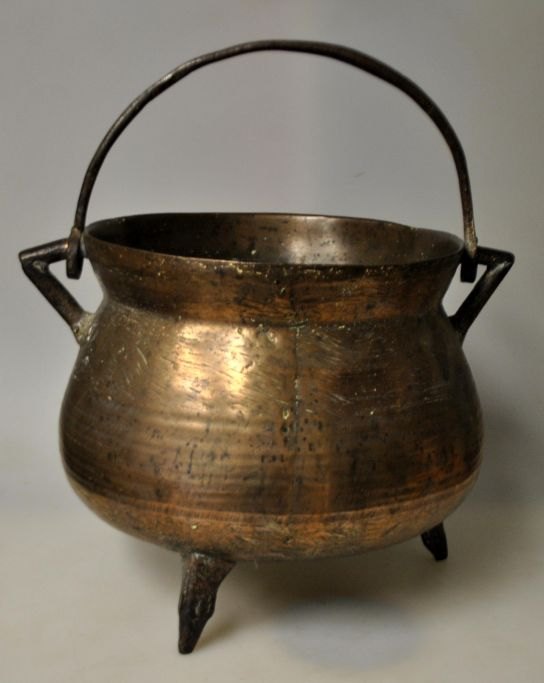 Three-legged pot in bronze, 17th/18th century. Northern Germany. With handle and three legs. Unmarked. H.: 20 cm. Height with handle: 30 cm. Dia.: 20.5 cm.Item number: 28217