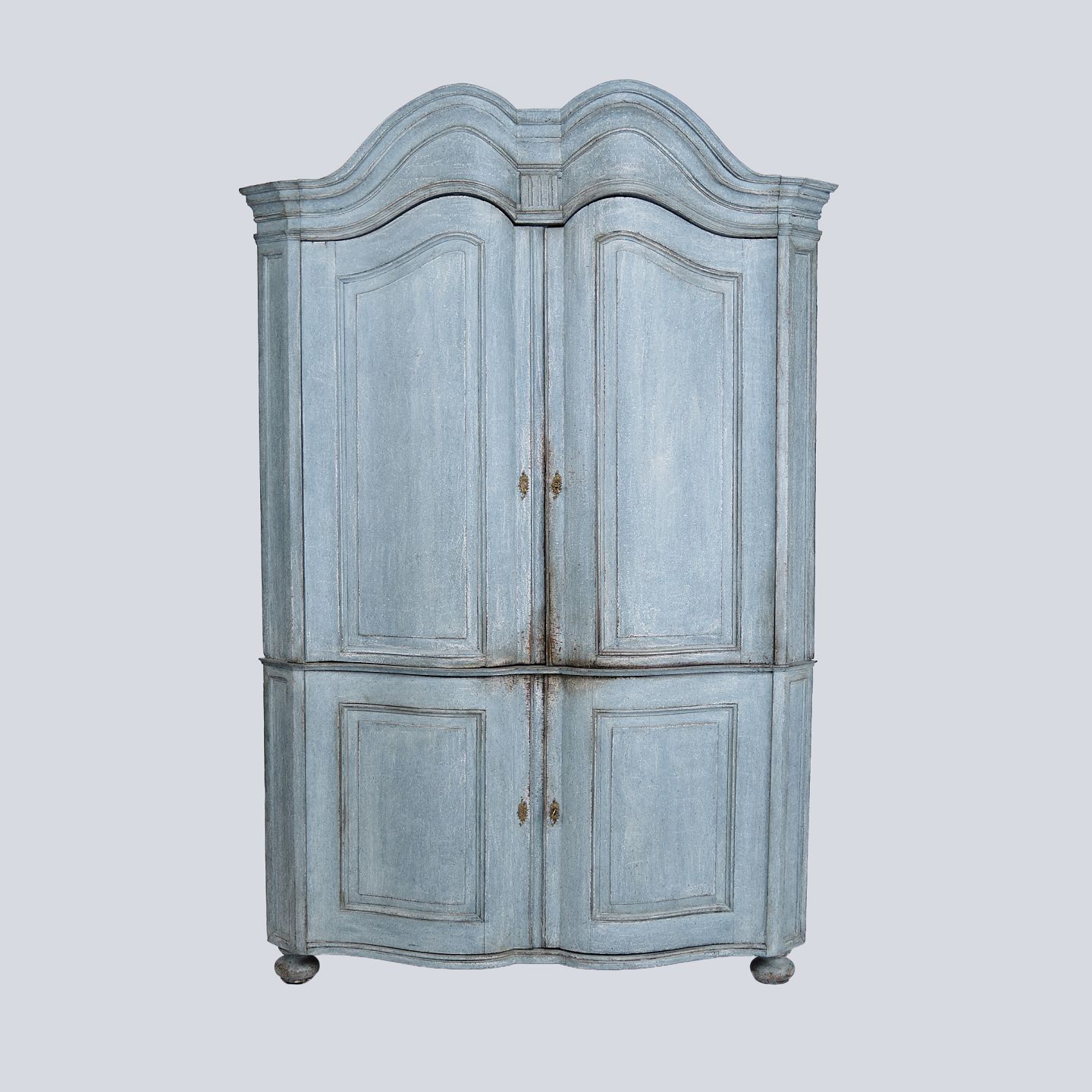 Large baroque corner cabinet from the 1780s. Original blue paint, curved doors and brass fittings. Rare and authentic antique furniture.— Period: 1780s