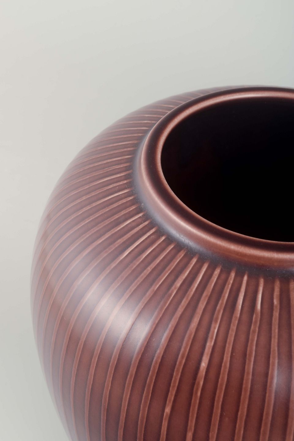 Organisk formet vase i fajance med reliefdekoreret overflade og dyb burgundy glasur med lodrette riller, som fremhæver formen.