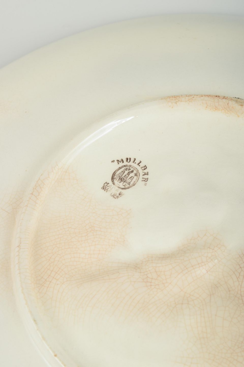 Gefle Porcelainsfabrik was founded in 1910 in Gävle, but faience production in the area dates back to the 19th century. In the late 1800s, transfer-printed and relief-decorated faience plates were highly popular, produced in large numbers for both household use and export. The “Mullbär” decoration is a typical example of the naturalistic ornamentation of the time, here enriched with classical putti motifs inspired by Renaissance and Baroque imagery.