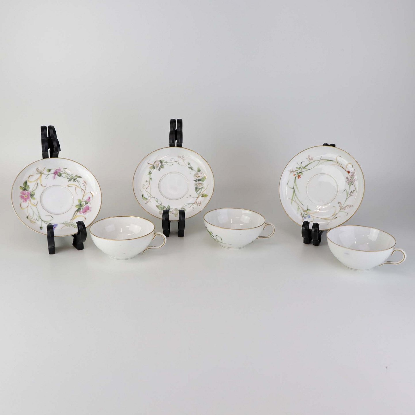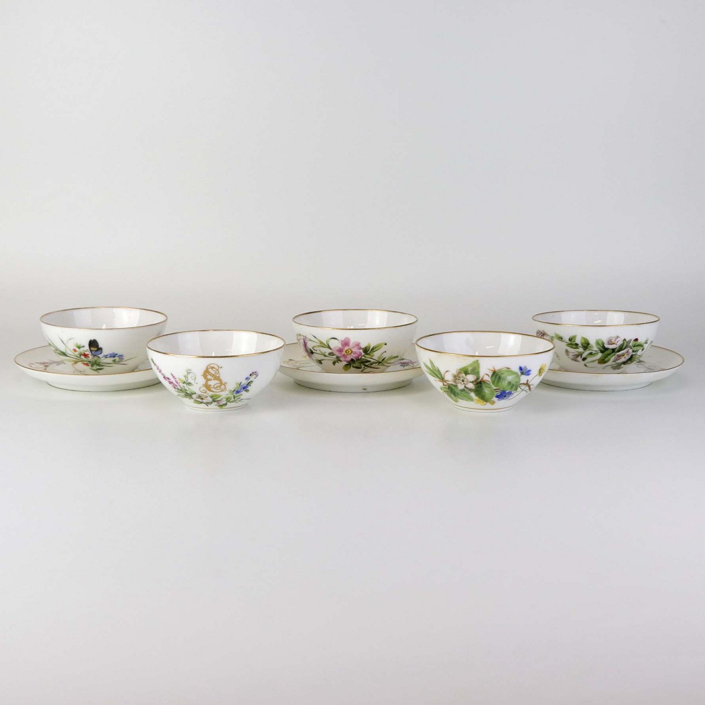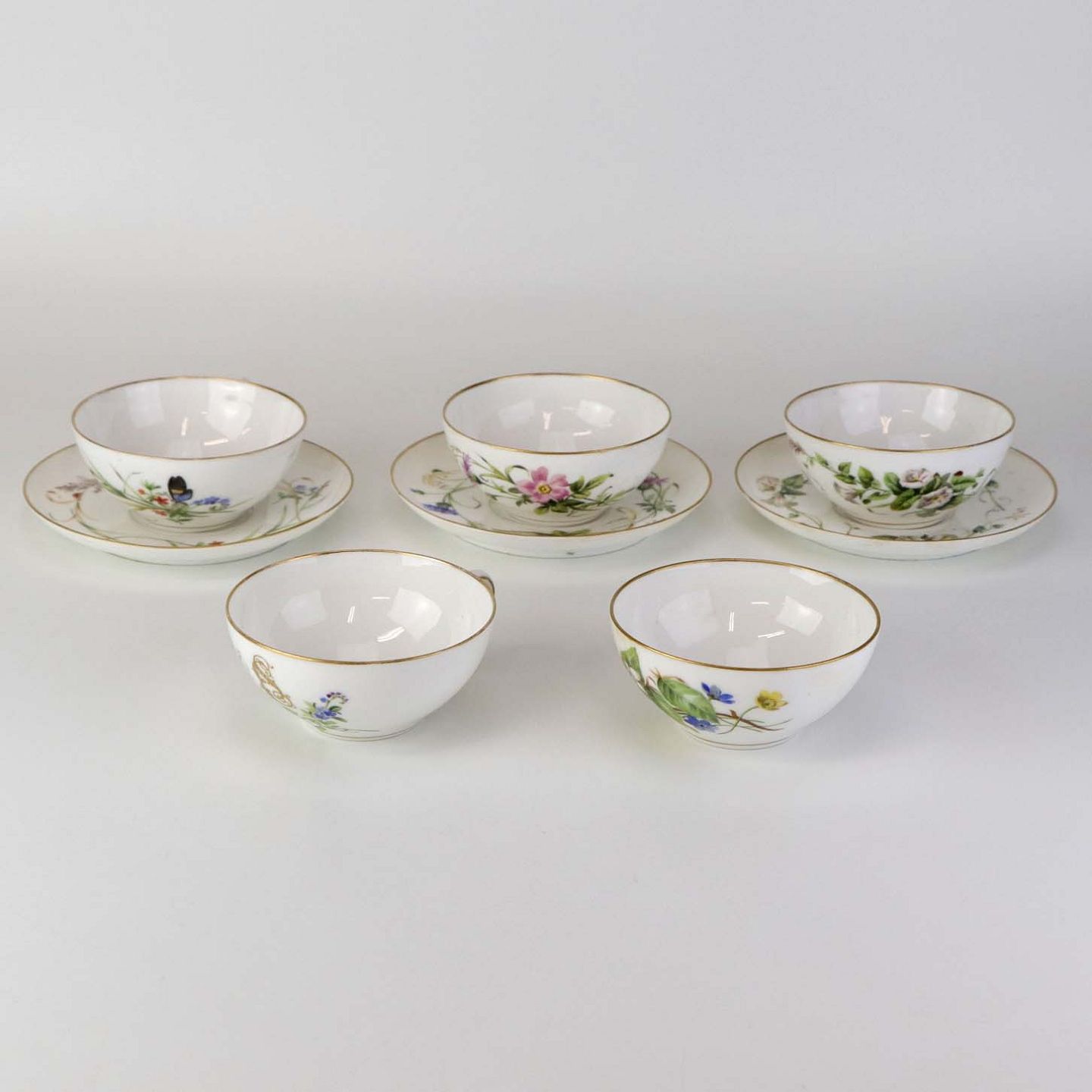 Sæt med fem styk kaffekopper og tre styk underkopper i porcelæn med håndmalede blomstermotiver og guldkant. Stellet fra ca 1850.Producent Royal Copenhagen