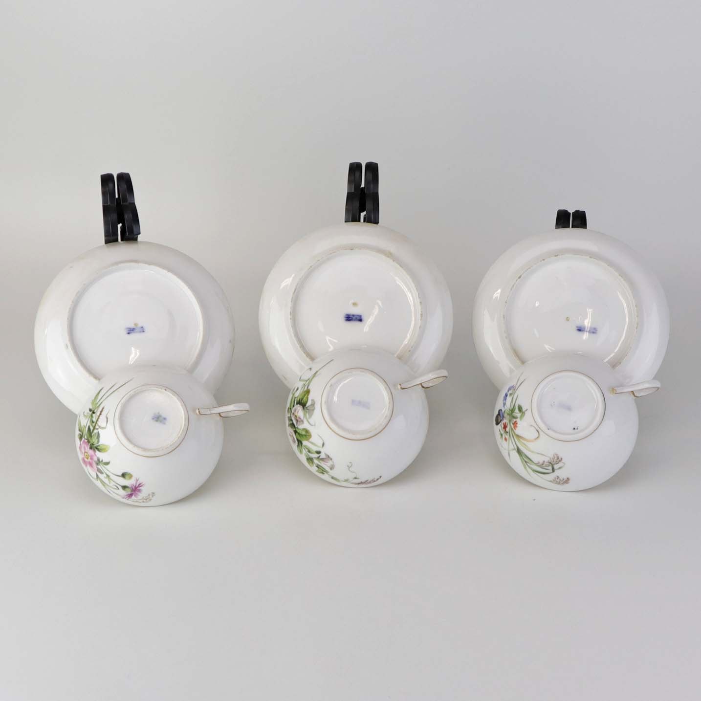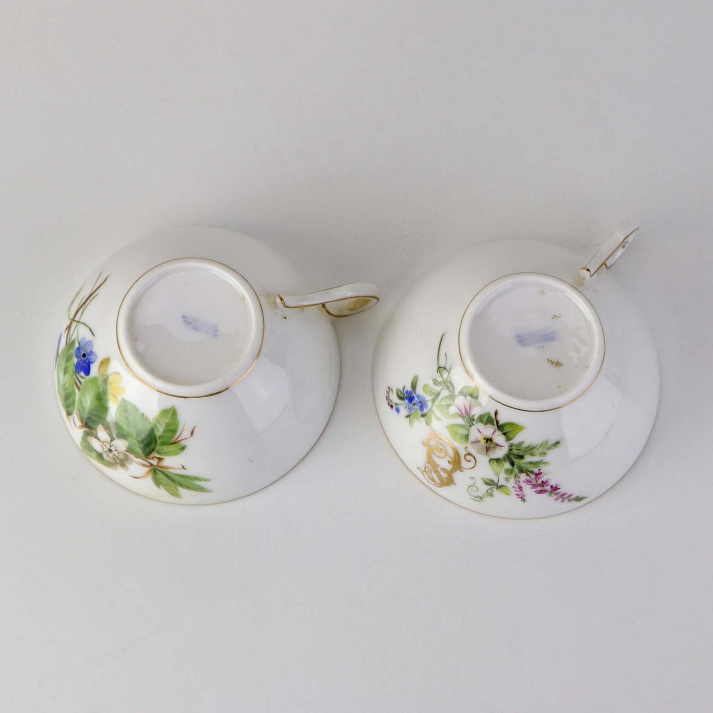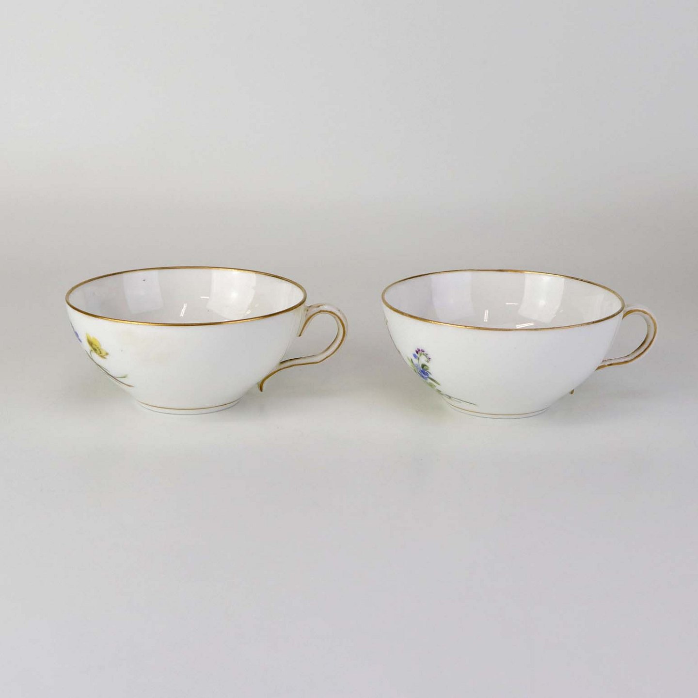 Sæt med fem styk kaffekopper og tre styk underkopper i porcelæn med håndmalede blomstermotiver og guldkant. Stellet fra ca 1850.Producent Royal Copenhagen