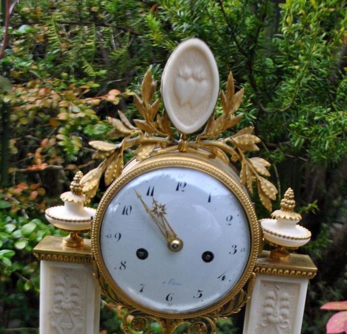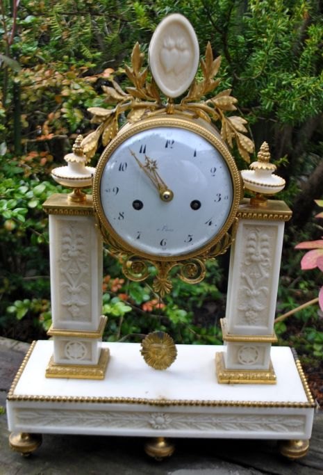 French column clock of gilt bronze and white marble, empire, ca. 1830. Columns and base with decoration. Clock case decorated with foliage in gilt bronze. Top marble plaque with two hearts on fire. Standard clockwork with bell. Dial in white enamel with Arabic numerals. With pendulum with sun.H. cm. W.: 31 cm. D.: 12 cm. : 43Item number: 28243