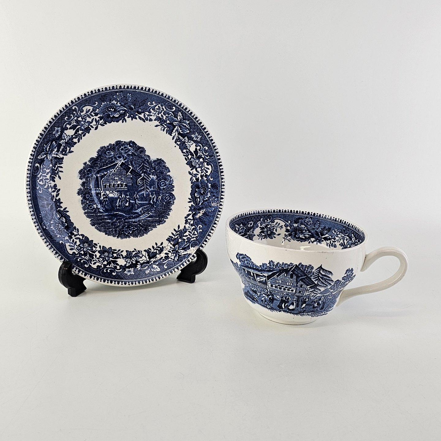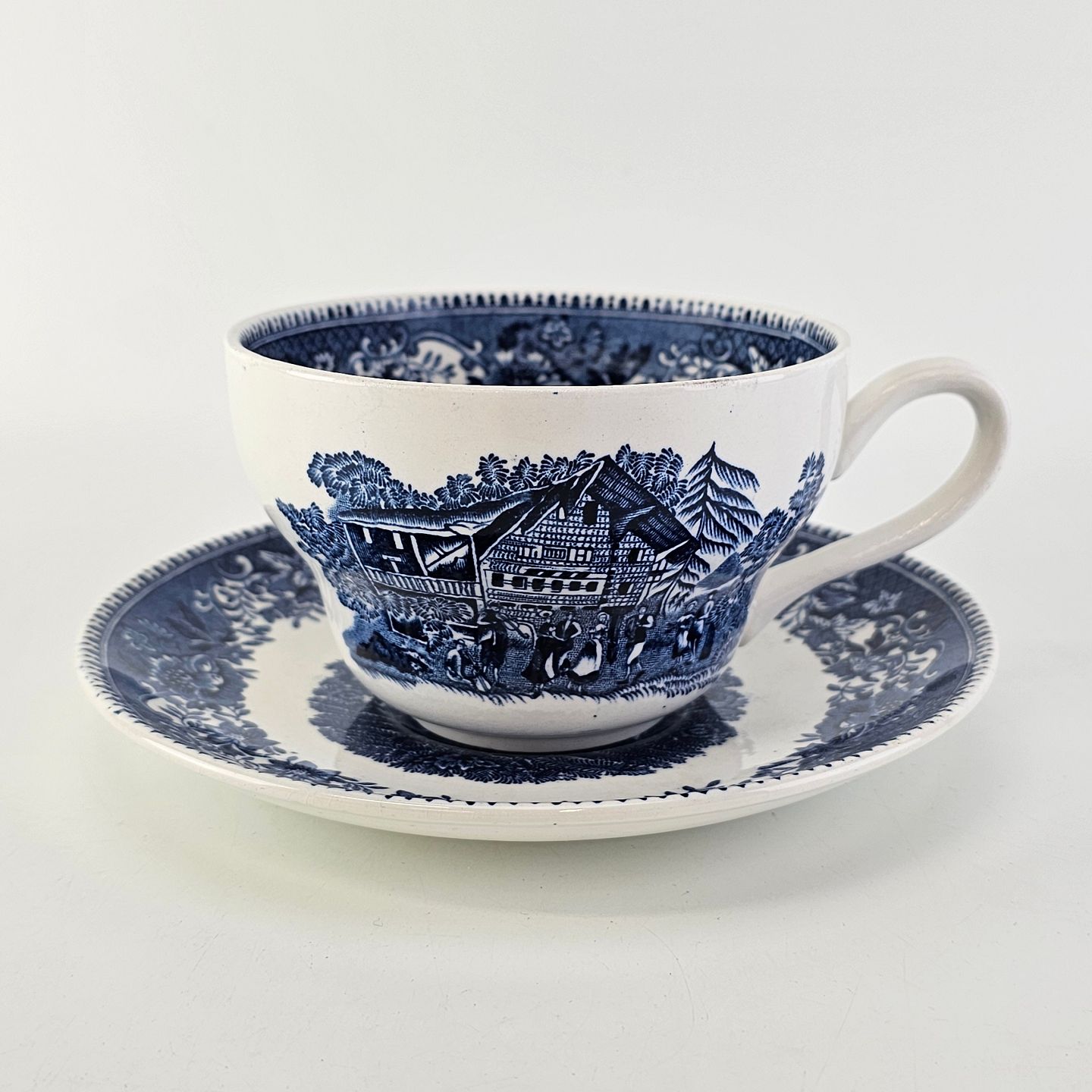 Blå kop og underkop i engelsk fajance fra stellet Avon CottageProduceret af Wedgwood & Co. LTD, England