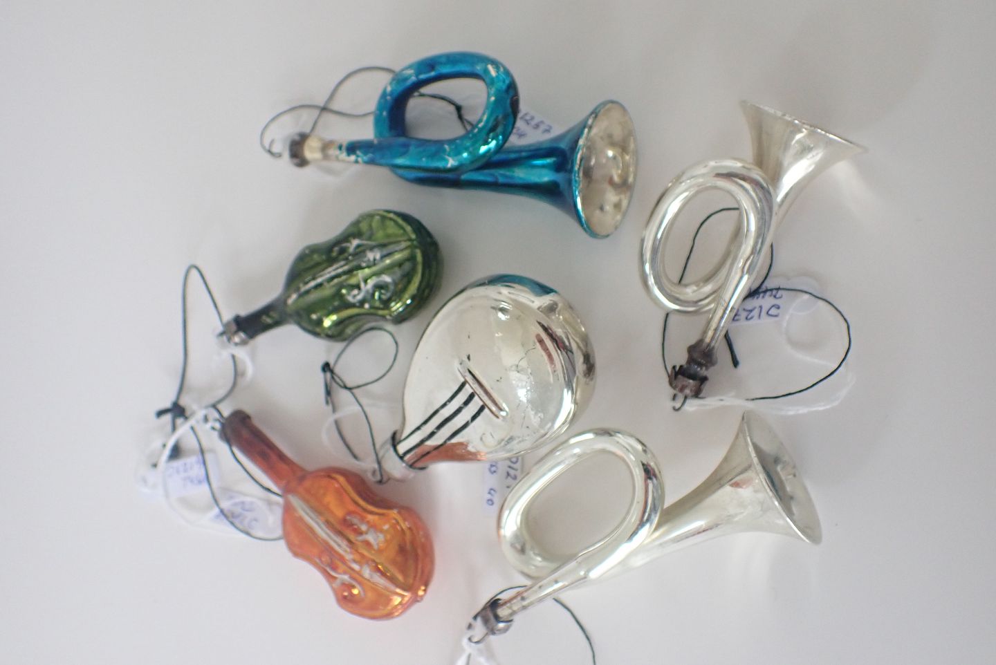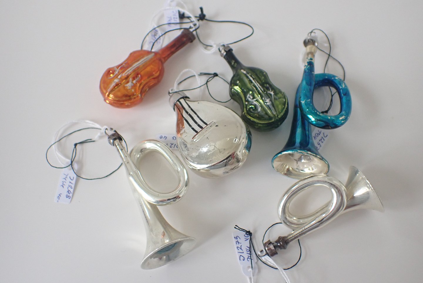 6 stk. glasjulepynt med ophæng. 5 tyske og 1 russisk mandolin. 1930 - 1940.