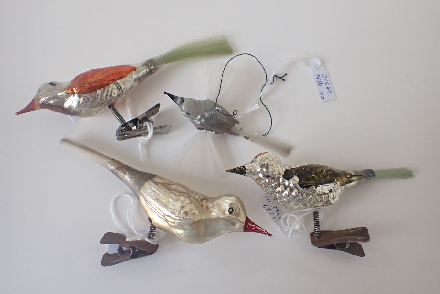 4 stk. glasjulepynt i form af fugle. 3 med metalklemme og en dobbeltvinget med glasophæng.