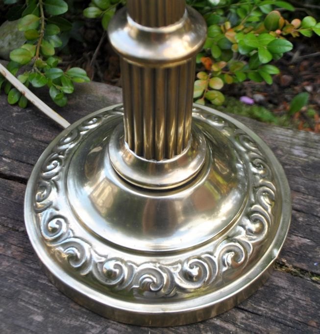 Brass table lamp, 1920 - 1930, Denmark. Base with decorations. Fluted column. Height without electrical installation: 31 cm. With installation: 50 cm.Looks freshly painted!