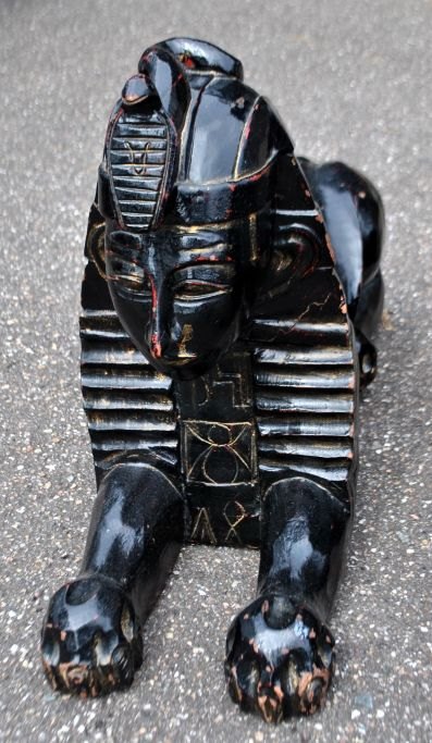 Pair of large decorative black-painted wooden sphinxes, 20th century, Egypt. L.: 65 cm. W.: 22 cm. H.: 44 cm.