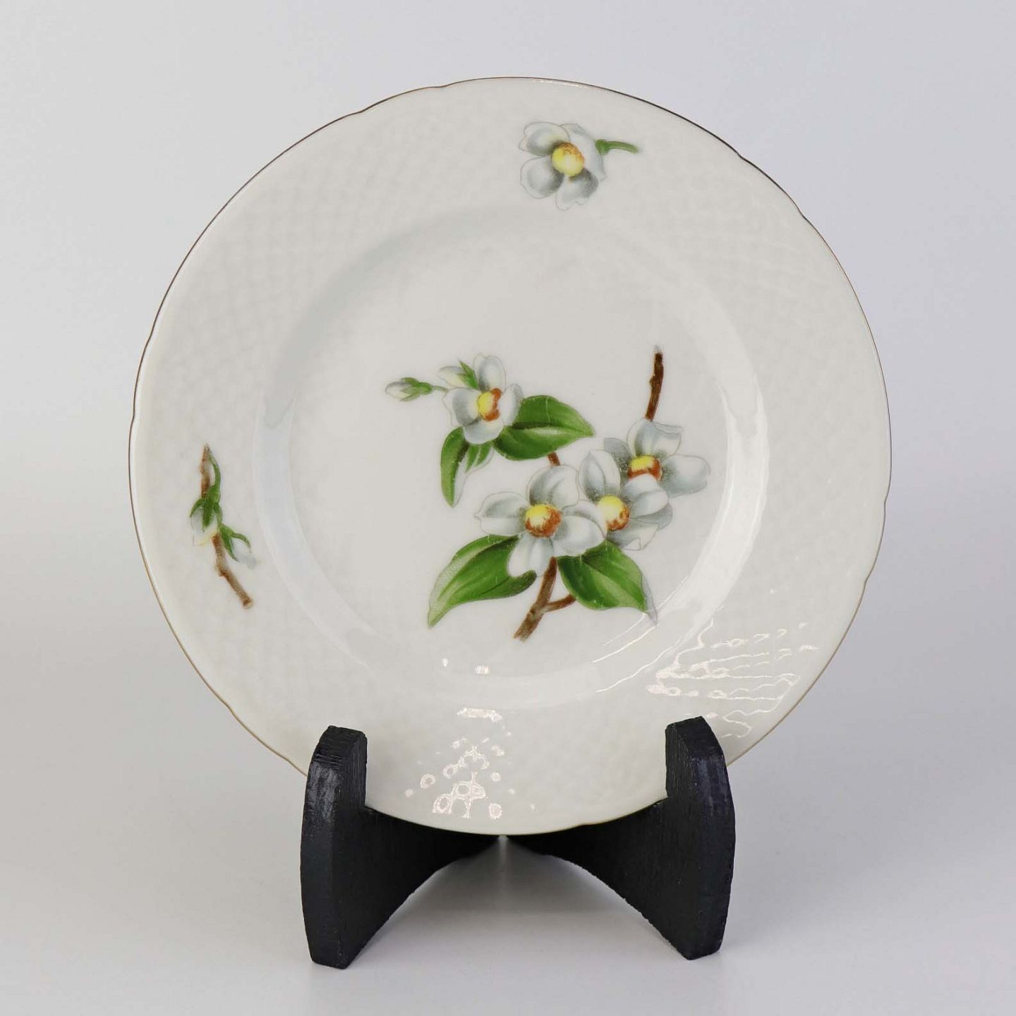 Heimdal er cremefarvet porcelæn i skælform, som dekoreret med jasminblomster, grene og en guldkant.
