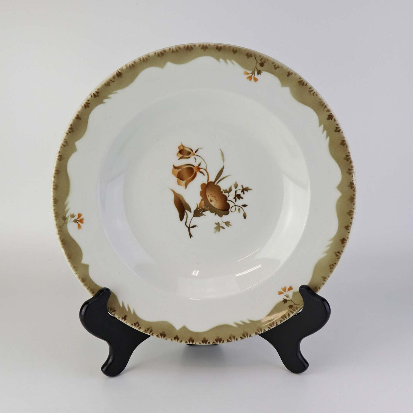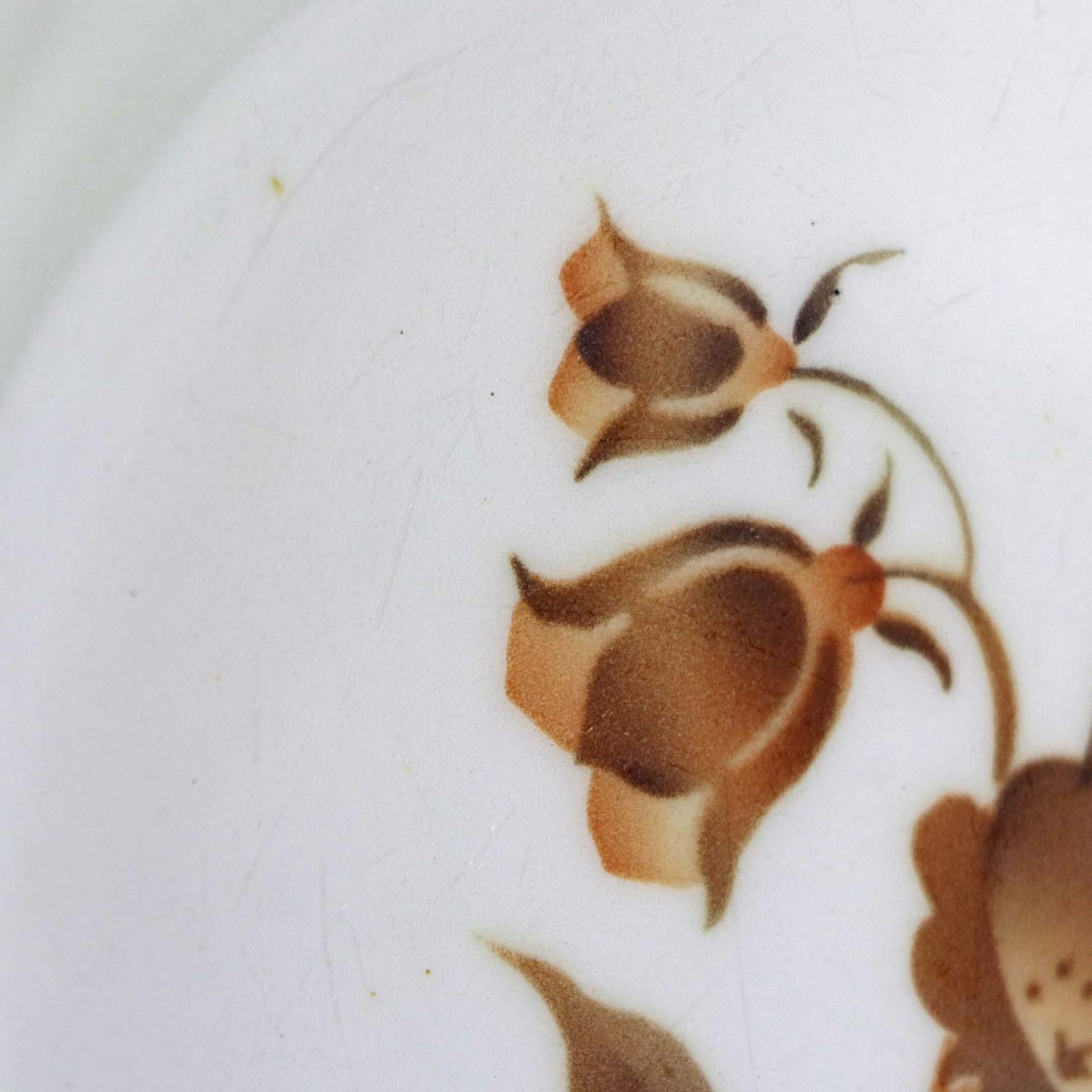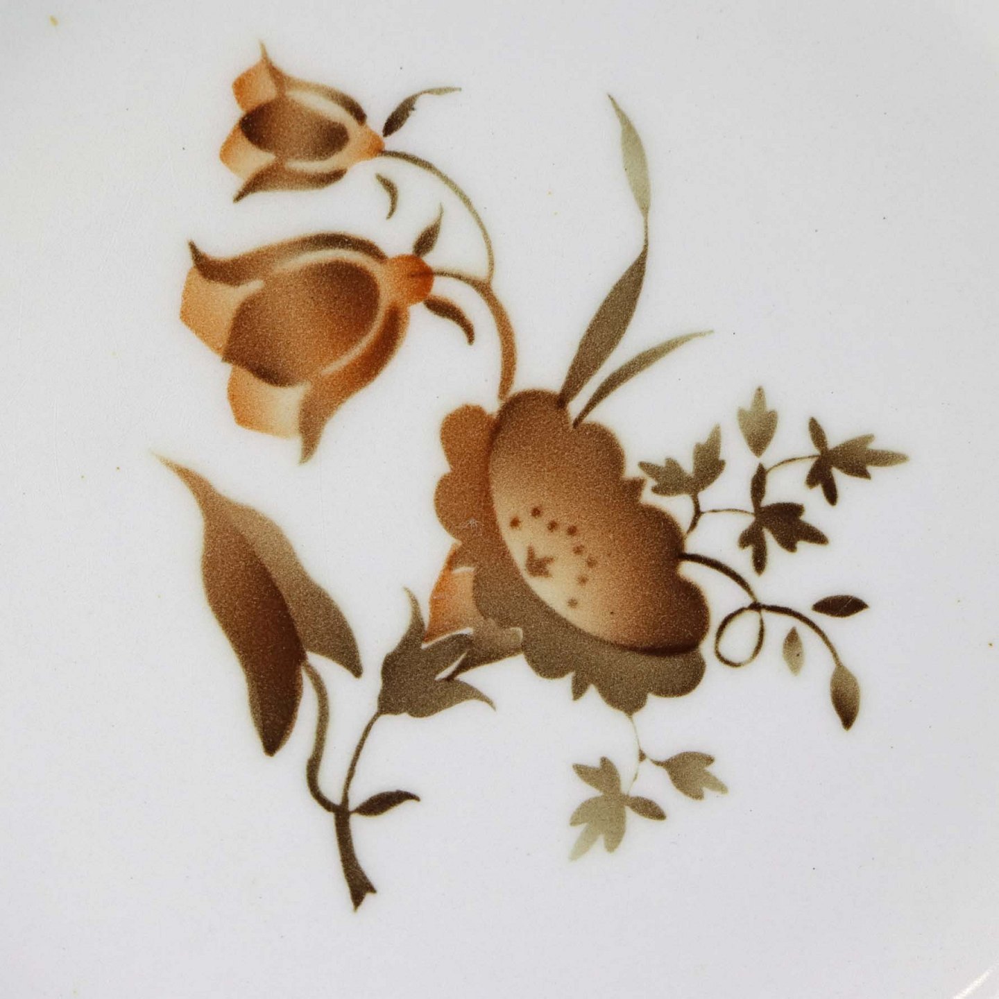 Stel i glat hvid fajance i stelform C med dekoration af brune snerleblomster og lysebrun kant med bladmotiv. Stellet blev produceret i perioden år 1930-1941