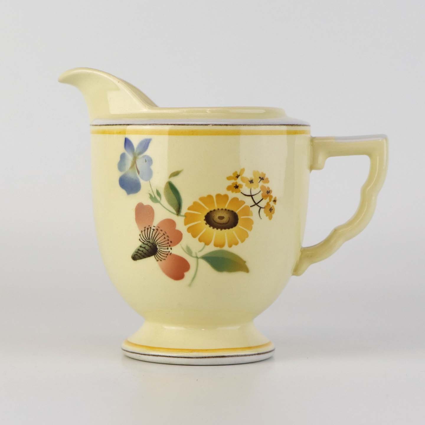 Stel i glat gul fajance med dekoration af farverige og forskelligartede blomster samt med gul og sort kantstreg.