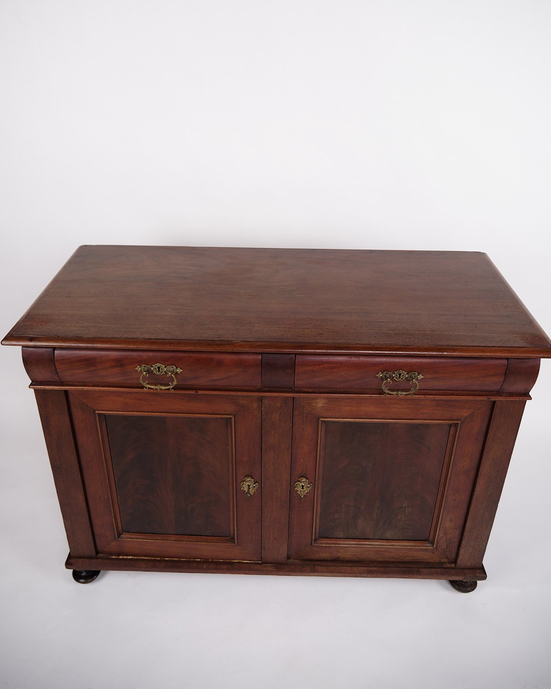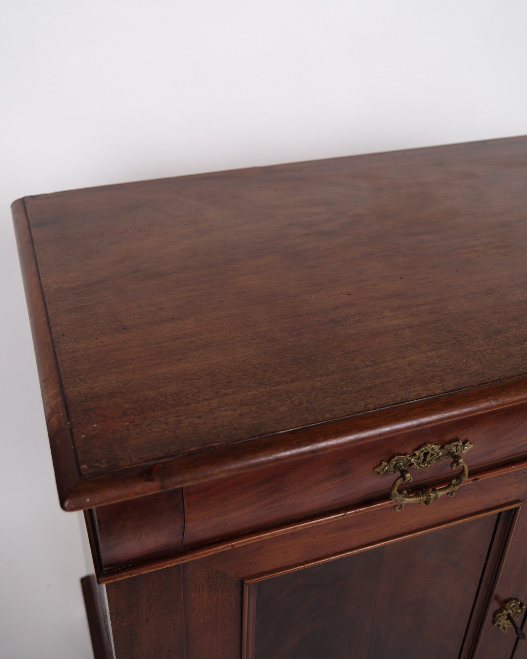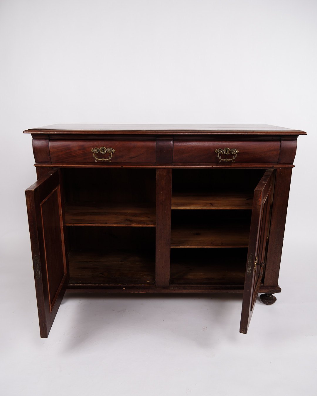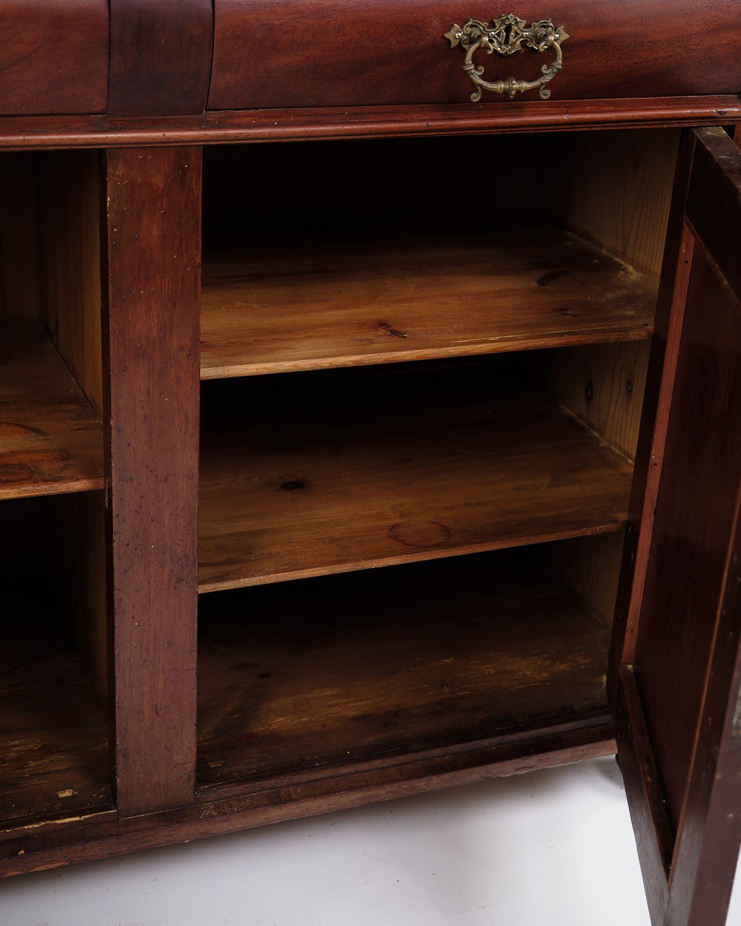low antique sideboard from the 1880s, made of hand-polished mahogany. The sideboard is furnished with fixed shelves and features period details that testify to the solid joinery craftsmanship of the 19th century.— Origin: Denmark