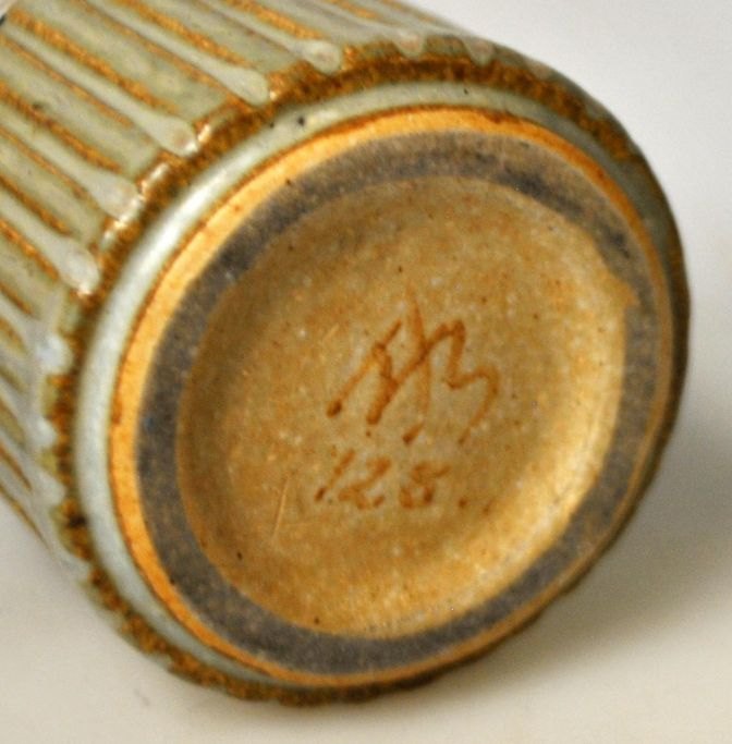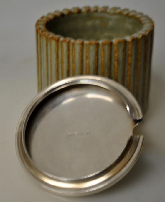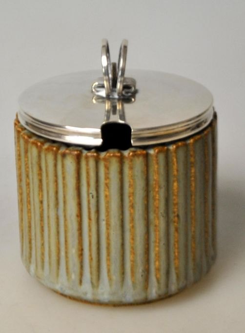 Bang, Arne (1901 - 1983) Denmark: Fluted stoneware Jam jar No. 128. Gray-green glaze. With silver-plated lid, Hugo Grün, Copenhagen. Signed monogram. Lid marked H. Gr. for Hugo Grün. H: 8.5 cm.Perfect condition!