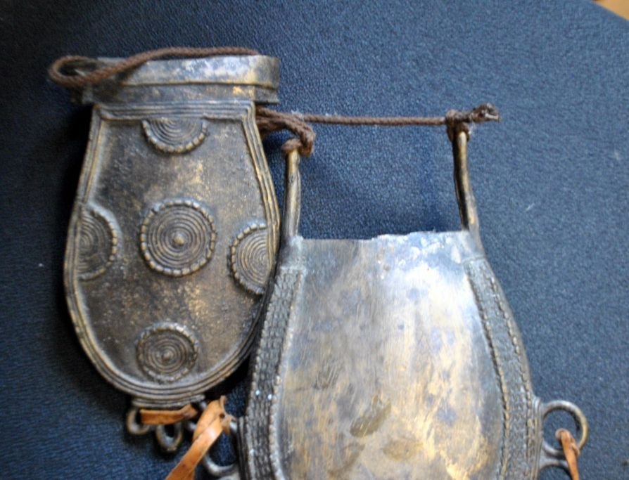 West African hunting bag in bronze, 20th century. Nigeria. With decorations. With rings with straps for downed animals. Height: 20 cm.brought to Denmark by a Danish family who lived in Nigeria for several years.