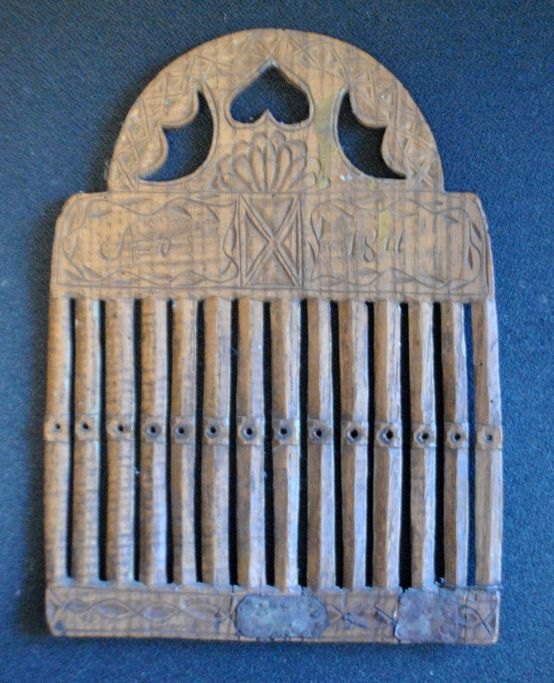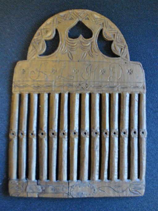 Antik dansk væve spjæld i bemalet bøg, 1811. Med karvsnit. Delvist bronzeret på en side. Med udskåret hjerte og intivalerne: A.L.H.D. 26 x 19 cm.