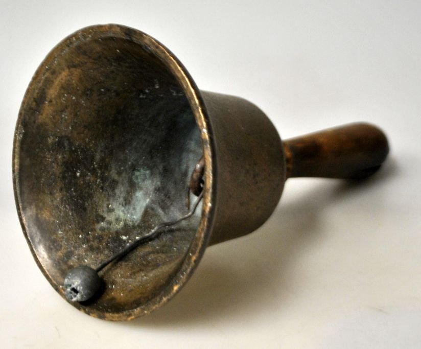 Antique 18th century baroque table bell made of ore. With a handle made of turned wood. H.: 22 cm.NB: The handle is split.