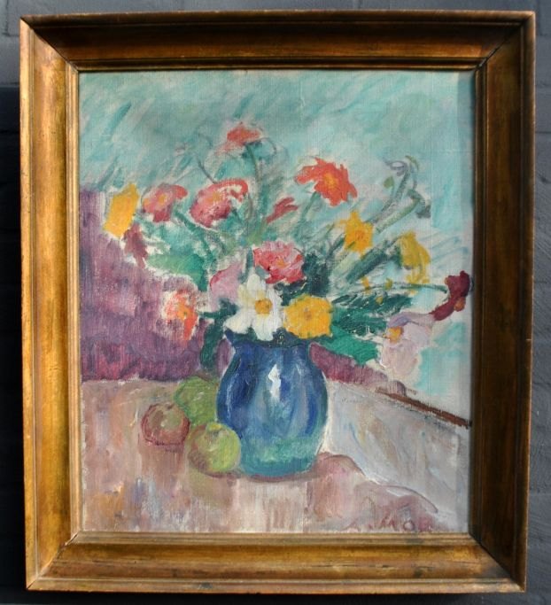 Moe, Andreas Carl (1877 - 1952) Denmark: Vase with flowers on a table. Oil on canvas. Signed. 63 x 51 cm.