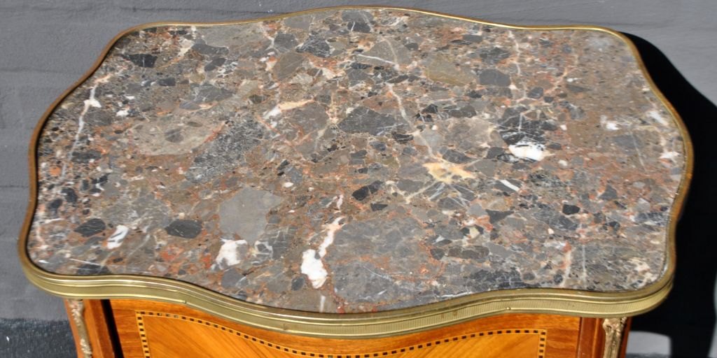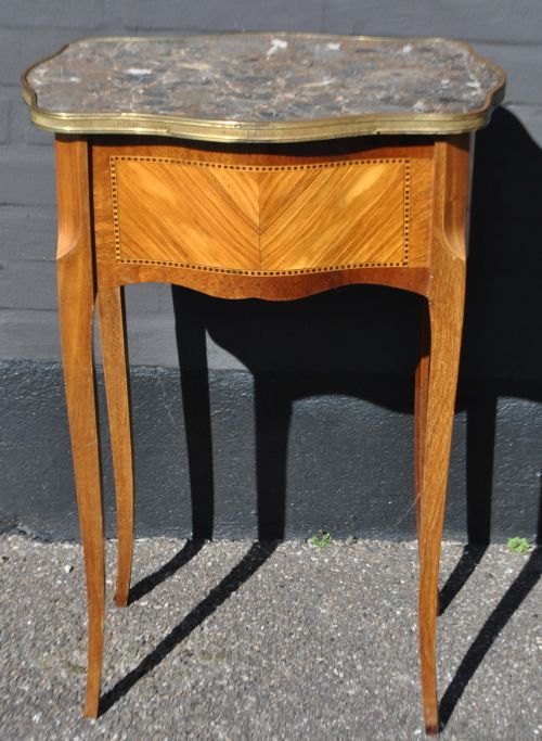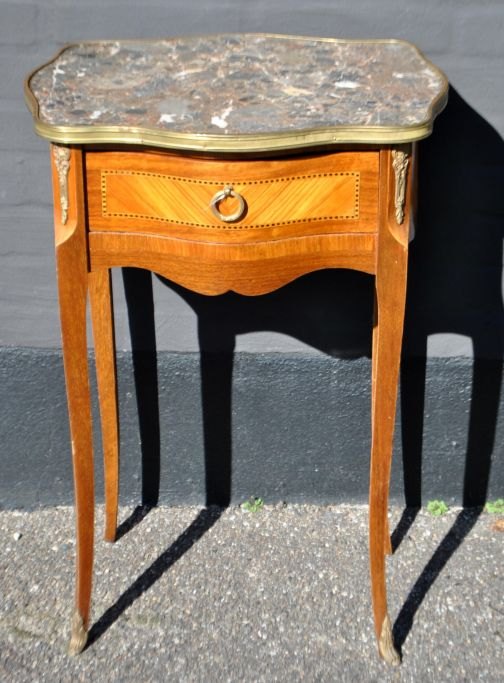 French lamp table, 20th century. With intarsia. With brass edge and variegated marble top. With bronze shoe. H,; 69 cm. W.: 47 cm. D.: 36 cm.