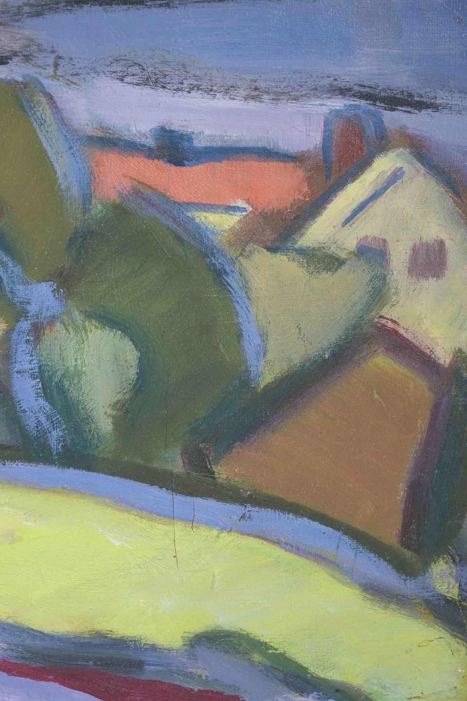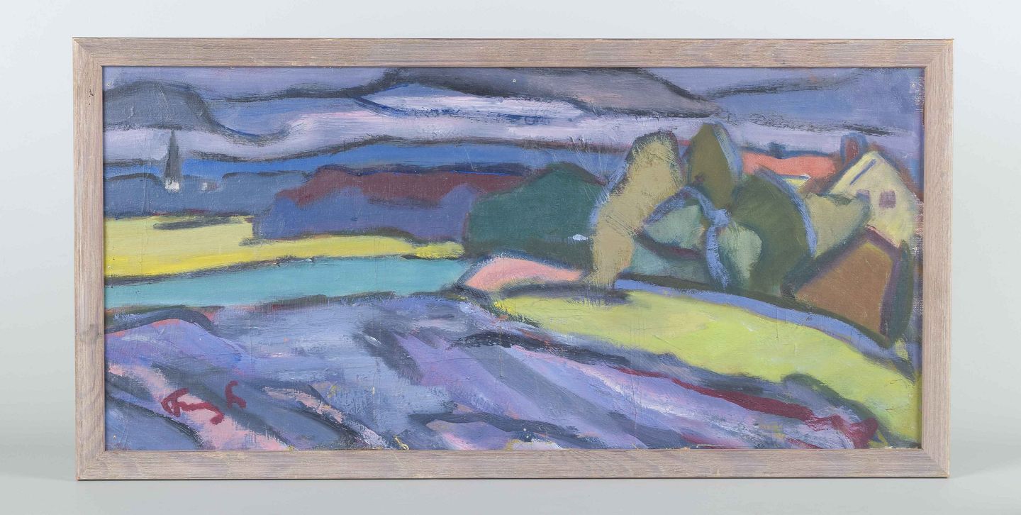 An expressive landscape painting executed in a colorful and simplified style, where blue and violet tones dominate the foreground, while green and yellow fields suggest meadows and vegetation. The painting is characterized by vigorous brushwork and an almost abstract composition, in which natural forms dissolve into rhythmic fields of color.