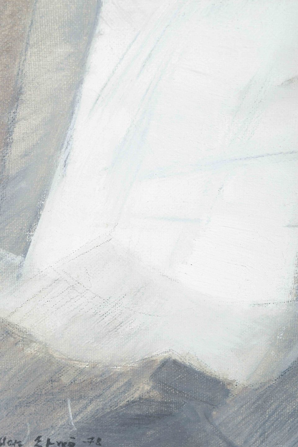 A subtle and atmospheric painting in shades of grey and white, where geometric and abstract forms merge into a composition that feels both precise and dreamlike. The work carries a minimalist expression, with the play of light in the white fields contrasted by darker, shadowed areas.