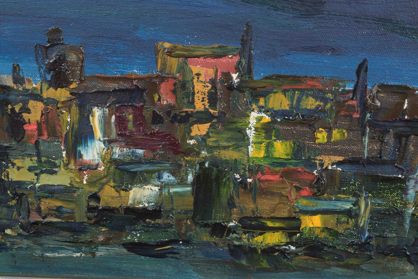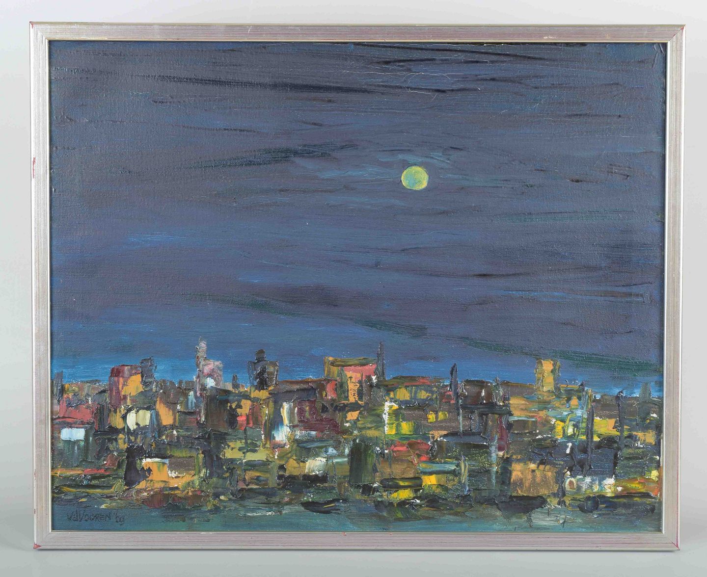 An expressive nocturnal cityscape with the moon and city lights under a dark sky, painted with bold brushwork and vibrant color.