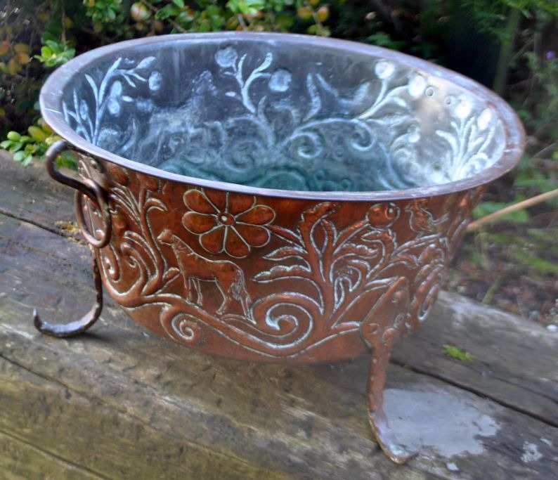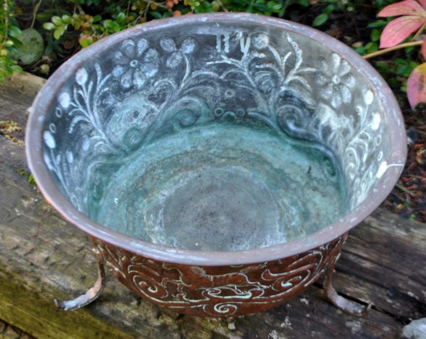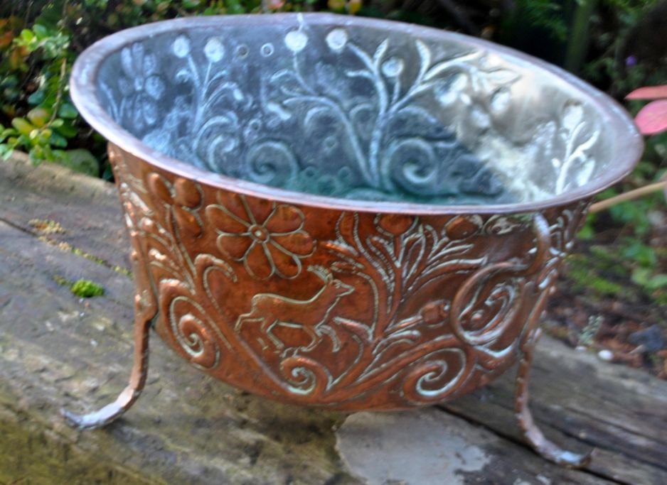 Kobber urtepotte, 18. årh. Danmark. Stemplet: 175?. Det sidste tal er delvist skjult af dekorationen. Med tre ben og to hanke. Med bankede dekorationer af blomster, træer, heste, fugle og rådyr på siden. H: 19 cm. Dia: 32,5 cm.
