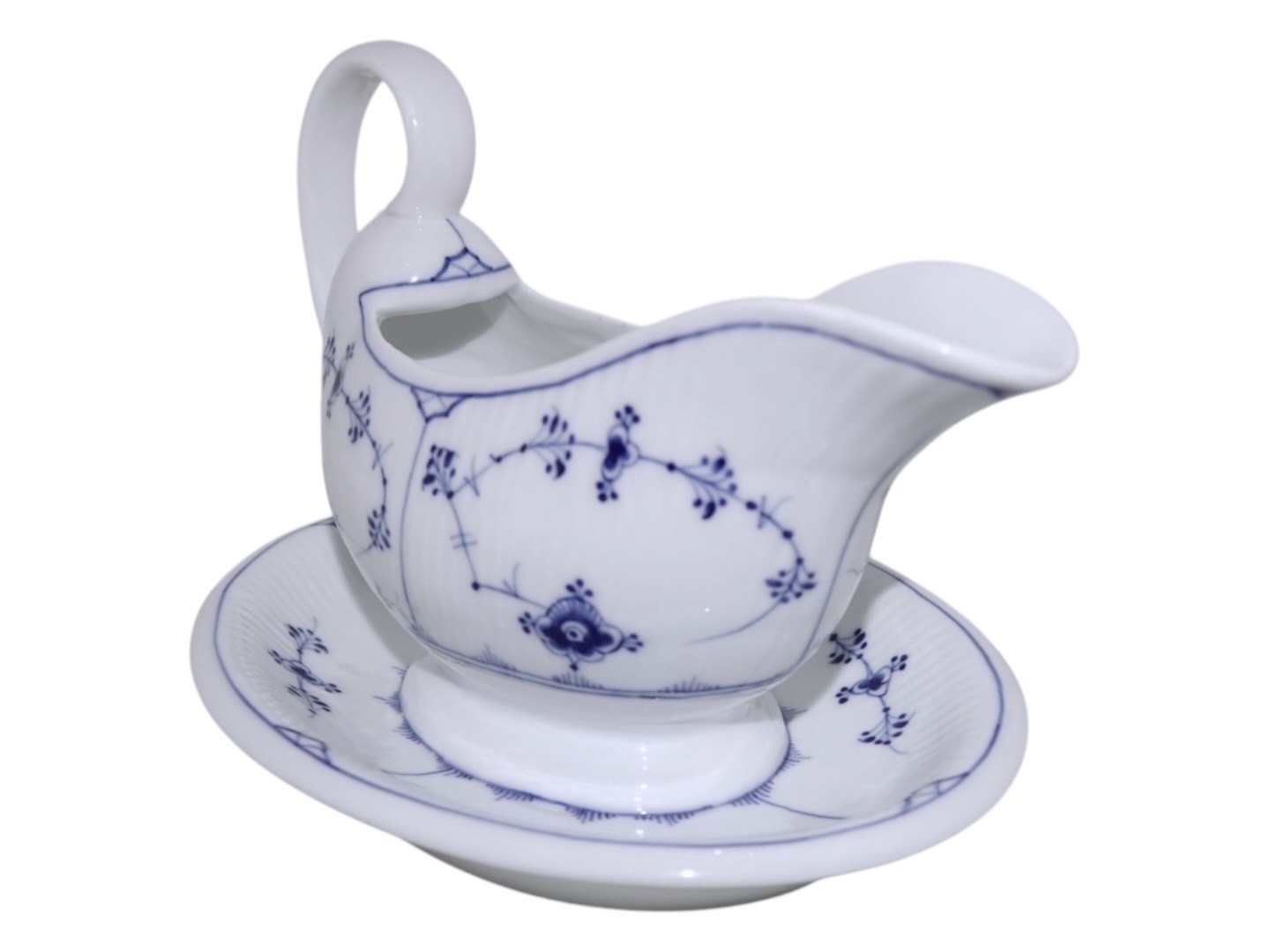 Royal Copenhagen Blue Fluted Plain gravy boat on fixed platter.The factory mark shows, that it was produced between 1894 and 1897.