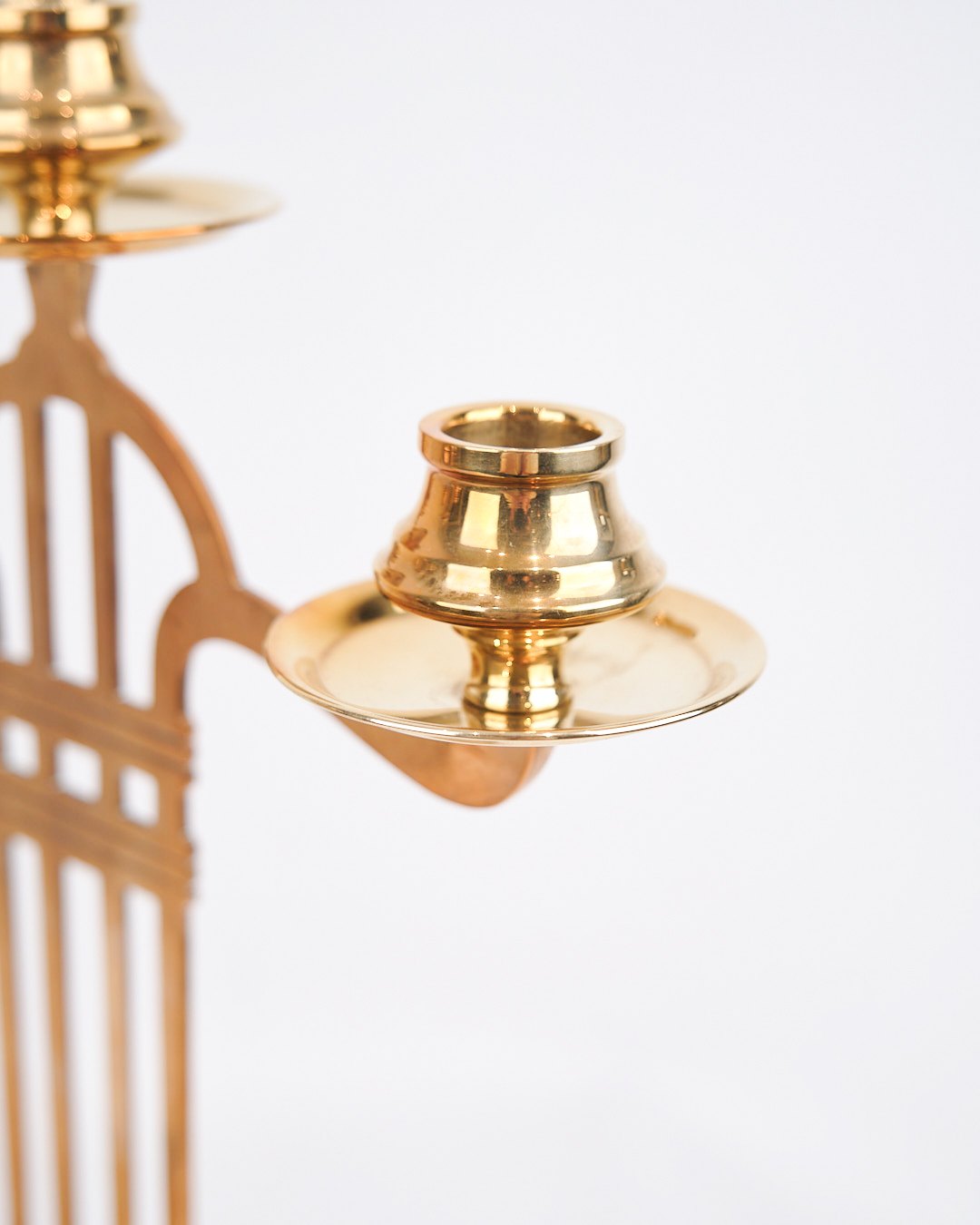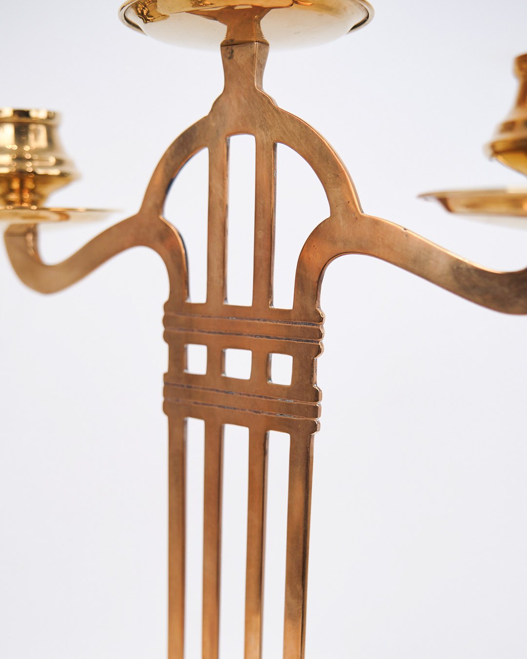Set of two tall three-armed brass candlesticks from the 1920s in Art Nouveau style.— Period: 1920s