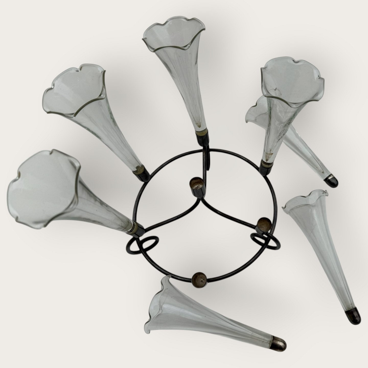 Epergne vase, Fine thin glass with frilled edge, all vases with silver plated mounting, 7 vases in art nouveau holder, approx. 19cm high and 24cm in diameter, each glass vase 13x5cm *Good condition*Stock: 1